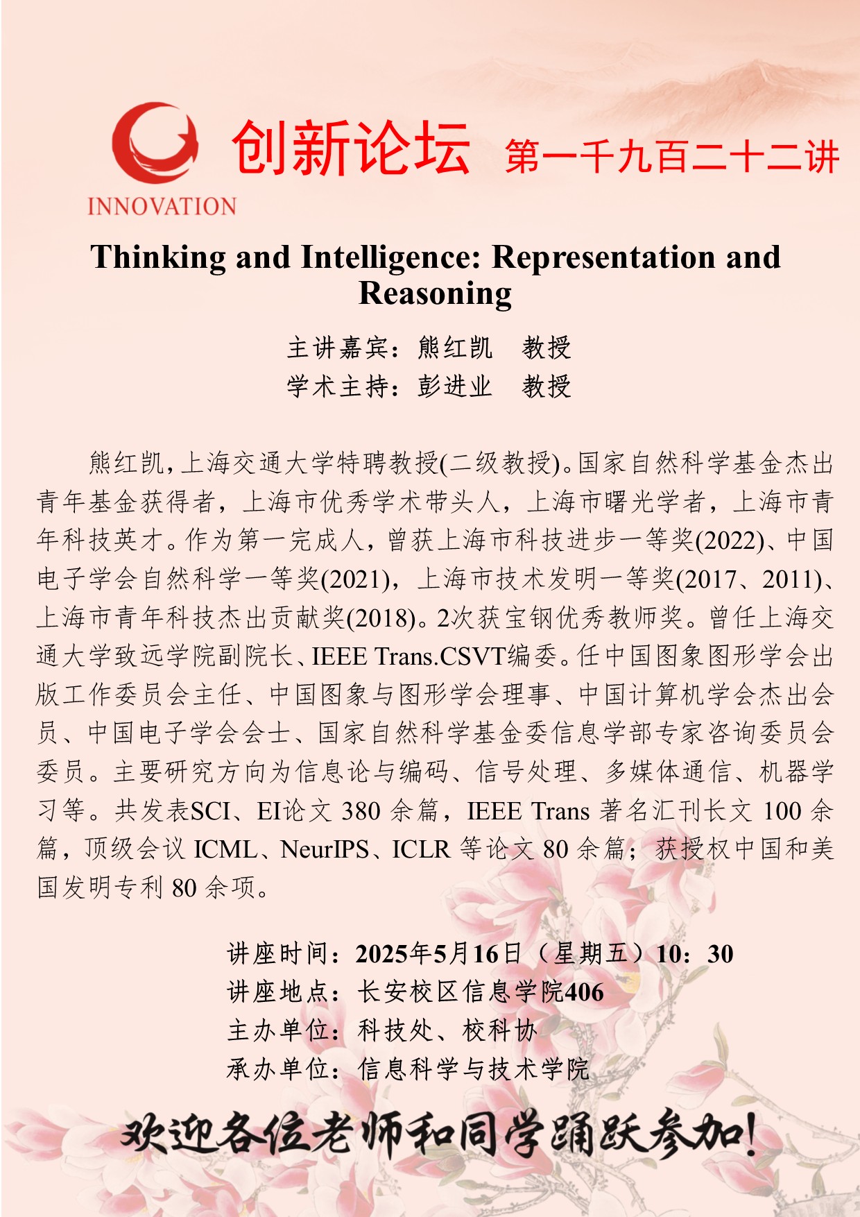 熊红凯 教授 bat365正版唯一官网创新论坛第一千九百二十二讲:Thinking and Intelligence: Representation and Reasoning 讲座时间 2025年5月16日(星期五)10:30 讲座地点 长安校区信息学院406 讲座人介绍 熊红凯 教授 讲座内容
