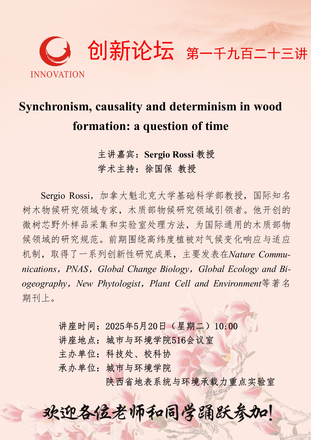 Sergio Rossi 教授 bat365正版唯一官网创新论坛第一千九百二十三讲:Synchronism, causality and determinism in wood formation: a question of time 讲座时间 2025年5月20日(星期二)10:00 讲座地点 城市与环境学院516会议室 讲座人介绍 Sergio Rossi 教授 讲座内容