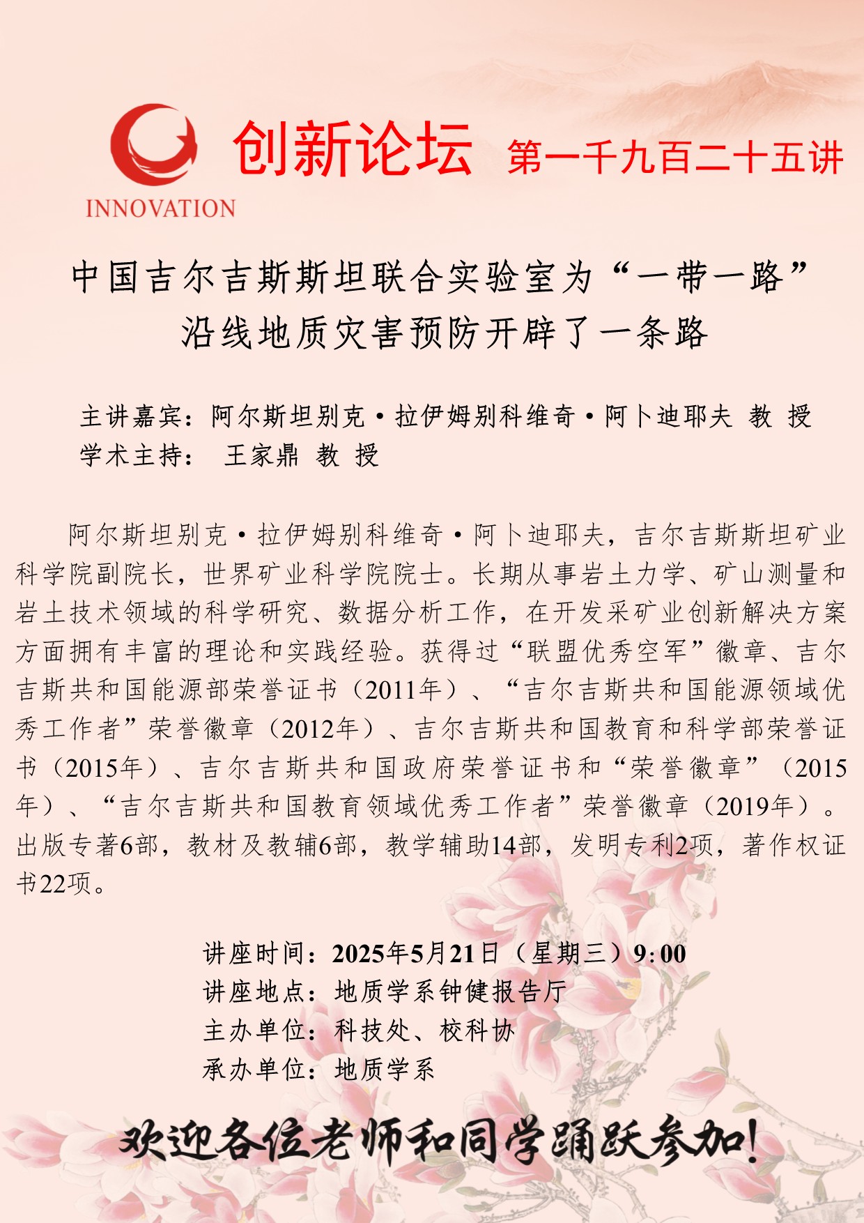 阿尔斯坦别克·拉伊姆别科维奇·阿卜迪耶夫 教授 bat365正版唯一官网创新论坛第一千九百二十五讲:中国吉尔吉斯斯坦联合实验室为“一带一路”沿线地质灾害预防开辟了一条路 讲座时间 2025年5月21日(星期三)9:00 讲座地点 地质学系钟健报告厅 讲座人介绍 阿尔斯坦别克·拉伊姆别科维奇·阿卜迪耶夫 教授 讲座内容