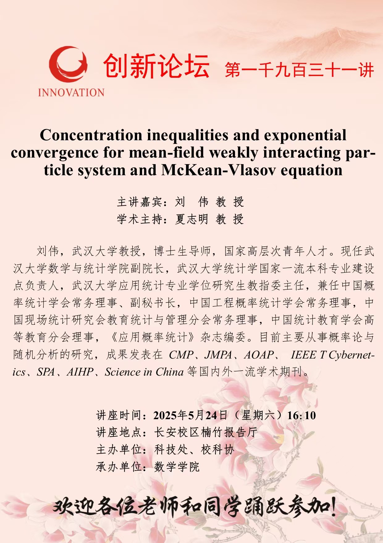 刘伟 教授 bat365正版唯一官网创新论坛第一千九百三十一讲:Concentration inequalities and exponential convergence for mean-field weakly interacting particle system and McKean-Vlasov equation 讲座时间 2025年5月24日(星期六)16:10 讲座地点 长安校区楠竹报告厅 讲座人介绍 刘伟 教授 讲座内容