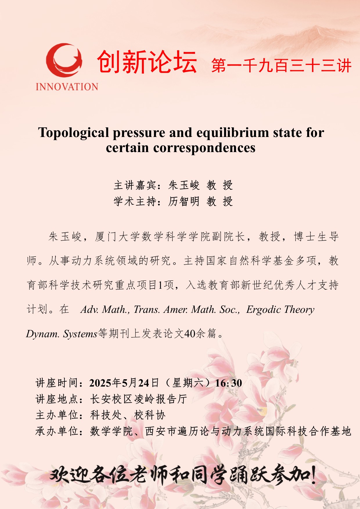 朱玉峻 教授 bat365正版唯一官网创新论坛第一千九百三十三讲:Topological pressure and equilibrium state for certain correspondences 讲座时间 2025年5月24日(星期六)16:30 讲座地点 长安校区凌岭报告厅 讲座人介绍 朱玉峻 教授 讲座内容