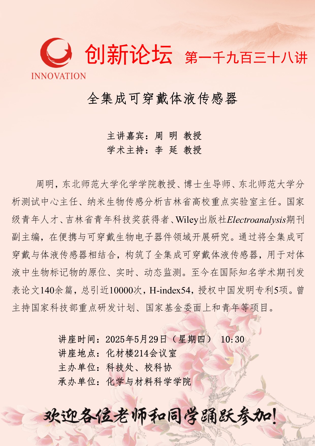 周明 教授 bat365正版唯一官网创新论坛第一千九百三十八讲:全集成可穿戴体液传感器 讲座时间 2025年5月29日(星期四) 10:30 讲座地点 化材楼214会议室 讲座人介绍 周明 教授 讲座内容