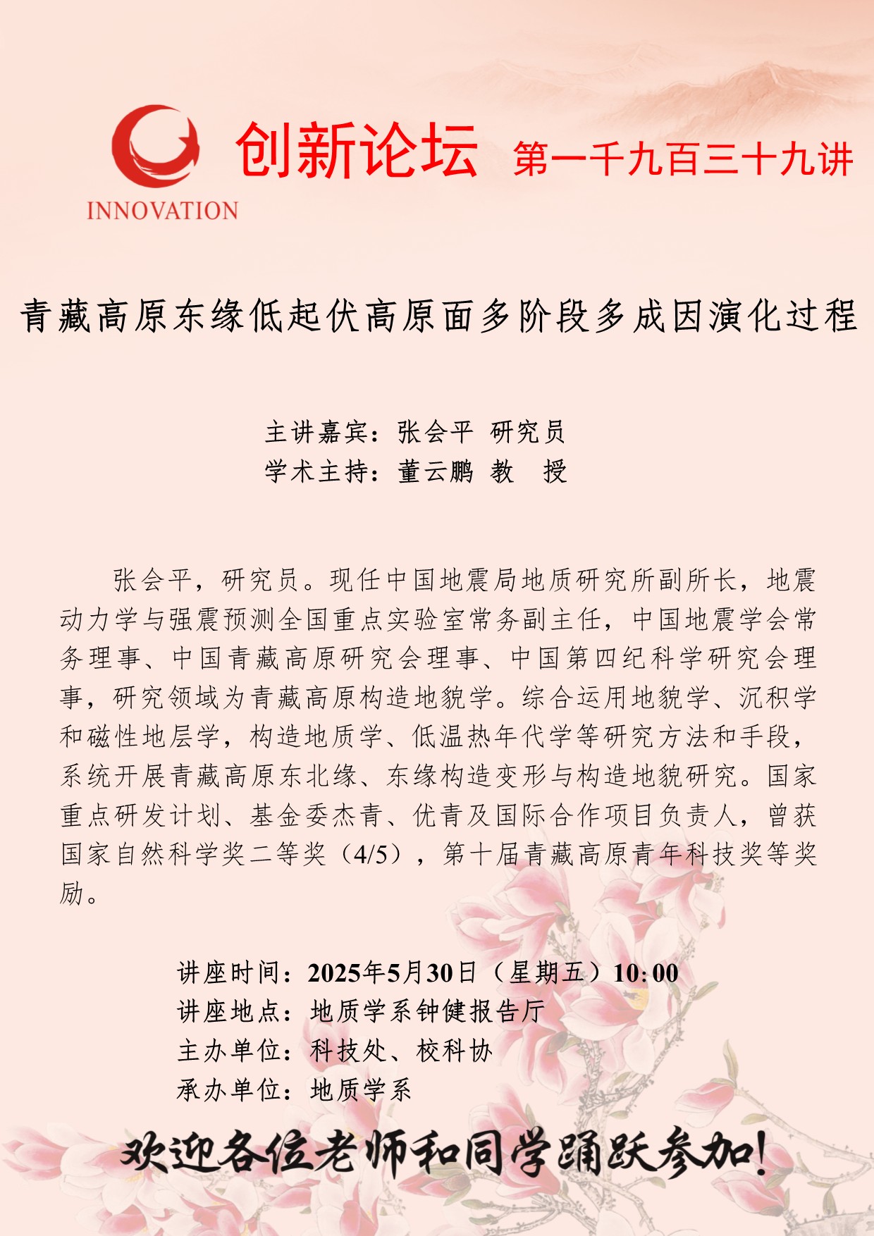 张会平 研究员 bat365正版唯一官网创新论坛第一千九百三十九讲:青藏高原东缘低起伏高原面多阶段多成因演化过程 讲座时间 2025年5月30日(星期五)10:00 讲座地点 地质学系钟健报告厅 讲座人介绍 张会平 研究员 讲座内容