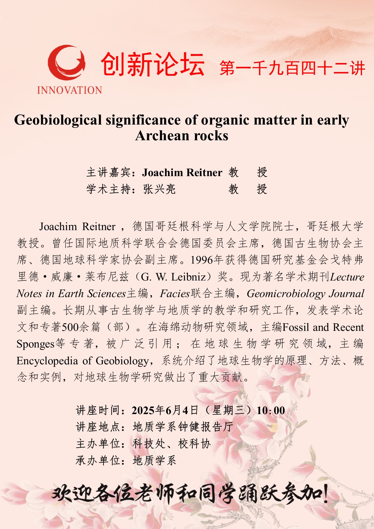 Joachim Reitner 教授 bat365正版唯一官网创新论坛第一千九百四十二讲:Geobiological significance of organic matter in early Archean rocks 讲座时间 2025年6月4日(星期三)10:00 讲座地点 地质学系钟健报告厅 讲座人介绍 Joachim Reitner 教授 讲座内容