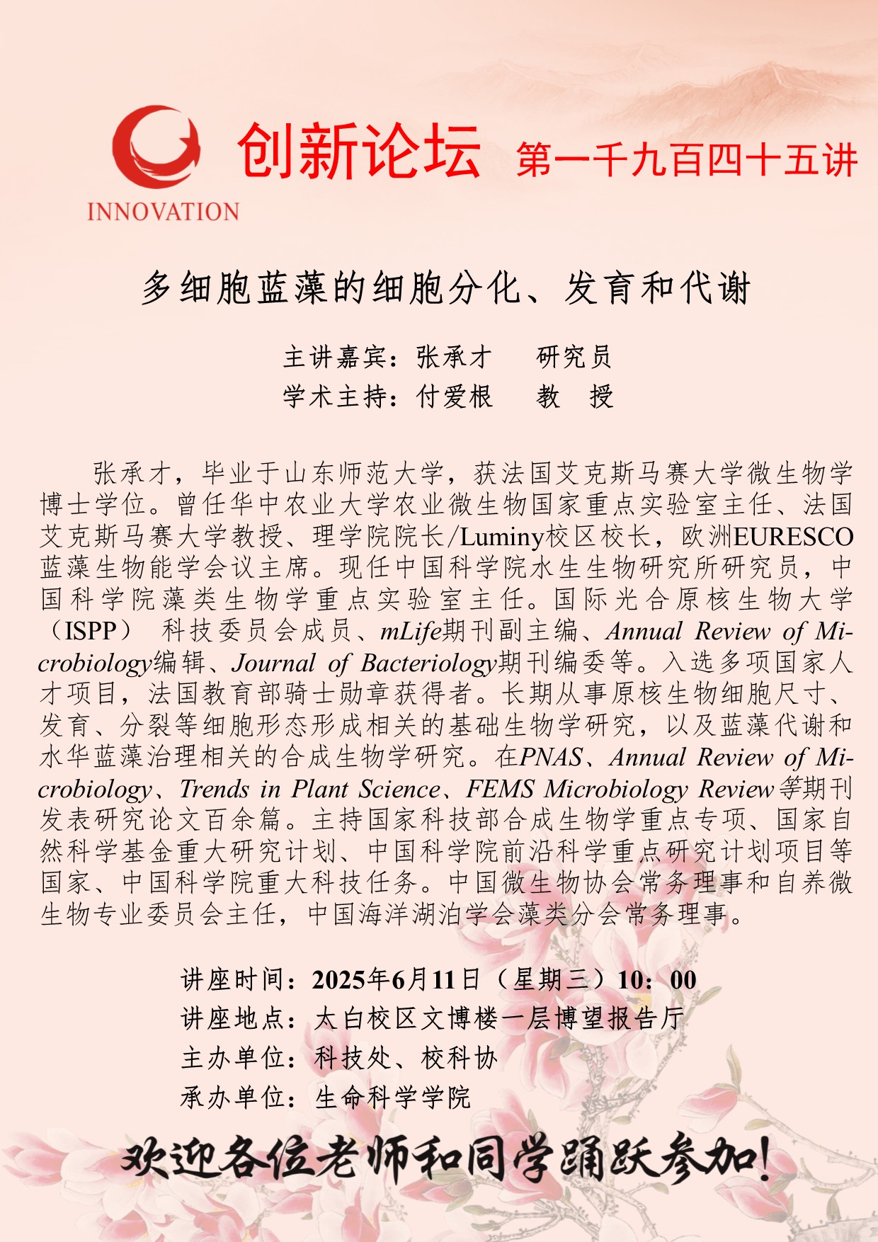 张承才 研究员 bat365正版唯一官网创新论坛第一千九百四十五讲:多细胞蓝藻的细胞分化、发育和代谢 讲座时间 2025年6月11日(星期三)10:00 讲座地点 太白校区文博楼一层博望报告厅 讲座人介绍 张承才 研究员 讲座内容
