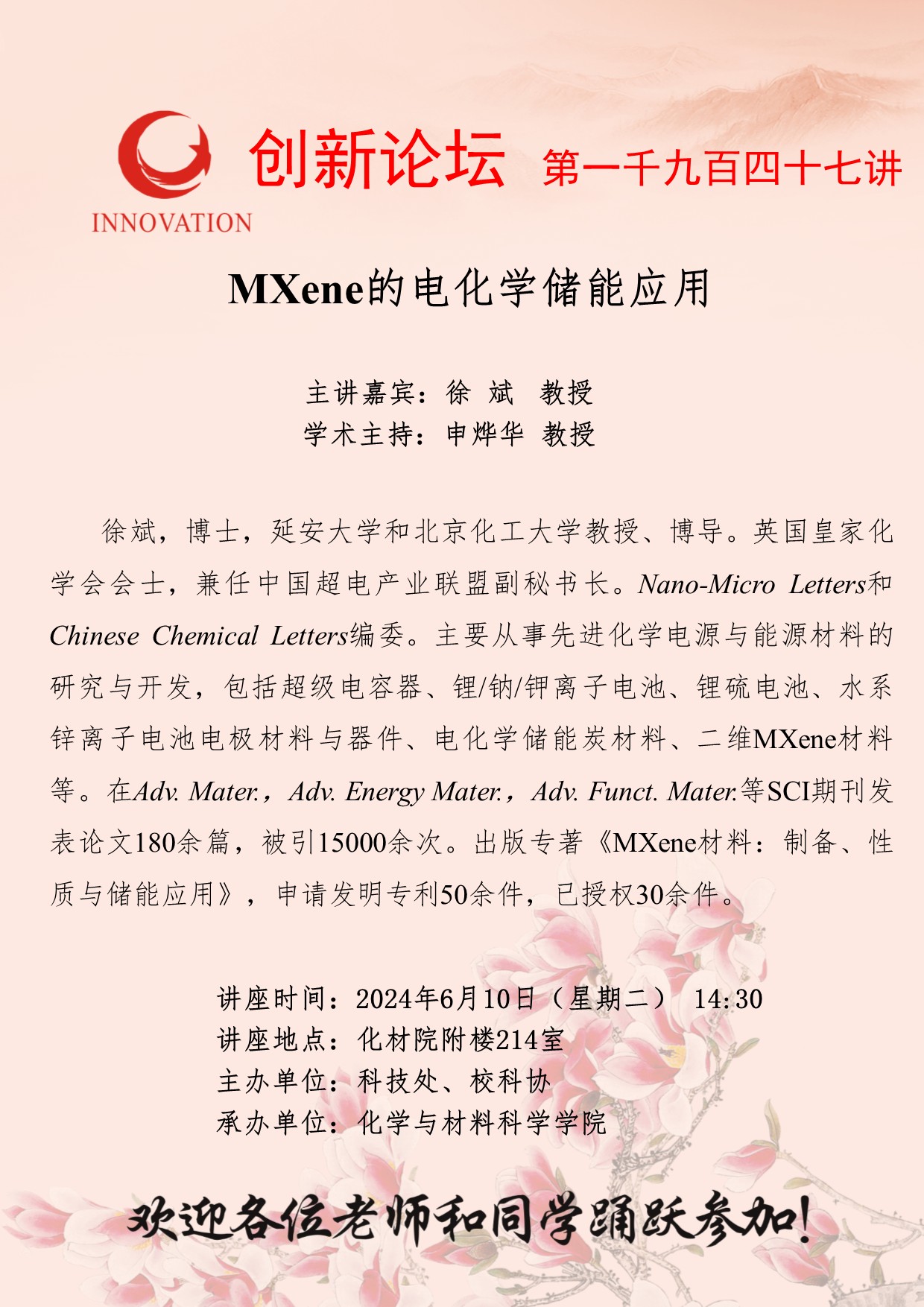 徐斌 教授 bat365正版唯一官网创新论坛第一千九百四十七讲:MXene的电化学储能应用 讲座时间 2024年6月10日(星期二) 14:30 讲座地点 化材院附楼214室 讲座人介绍 徐斌 教授 讲座内容
