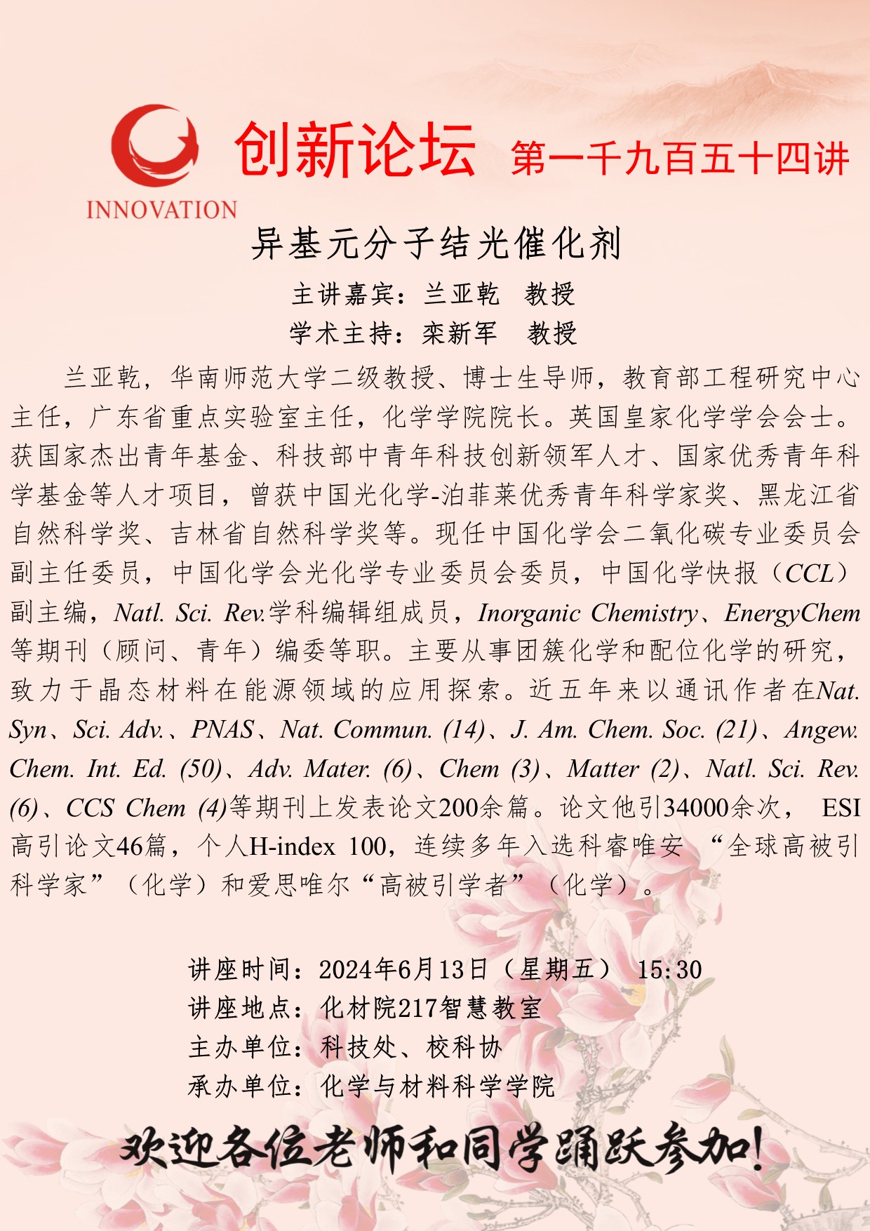 兰亚乾 教授 bat365正版唯一官网创新论坛第一千九百五十四讲:异基元分子结光催化剂 讲座时间 2024年6月13日(星期五) 15:30 讲座地点 化材院217智慧教室 讲座人介绍 兰亚乾 教授 讲座内容