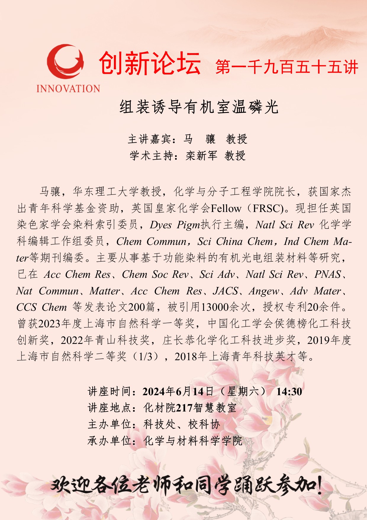 马骧 教授 bat365正版唯一官网创新论坛第一千九百五十五讲:组装诱导有机室温磷光 讲座时间 2024年6月14日(星期六) 14:30 讲座地点 化材院217智慧教室 讲座人介绍 马骧 教授 讲座内容