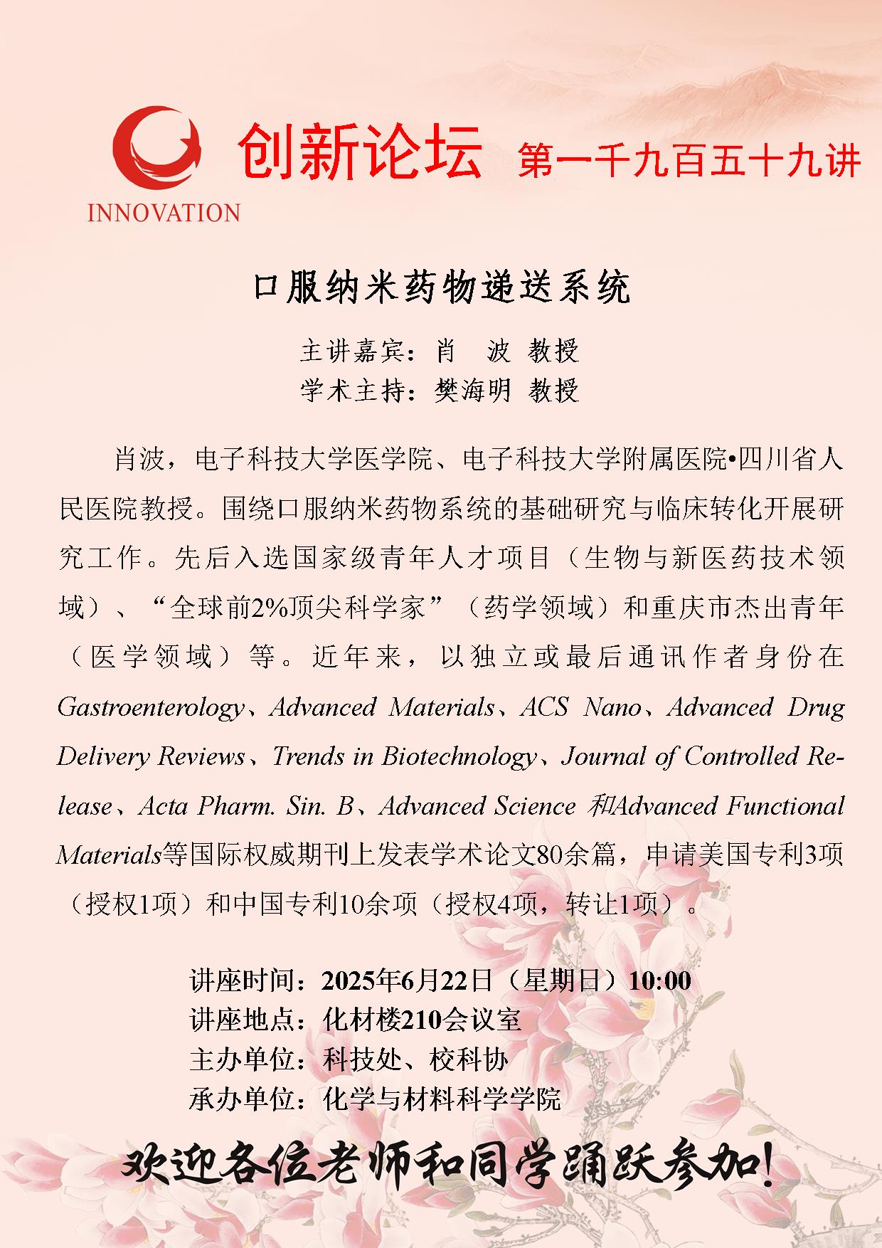 肖波 教授 bat365正版唯一官网创新论坛第一千九百五十九讲: 口服纳米药物递送系统 讲座时间 2025年6月22日(星期日)10:00 讲座地点 化材楼210会议室 讲座人介绍 肖波 教授 讲座内容