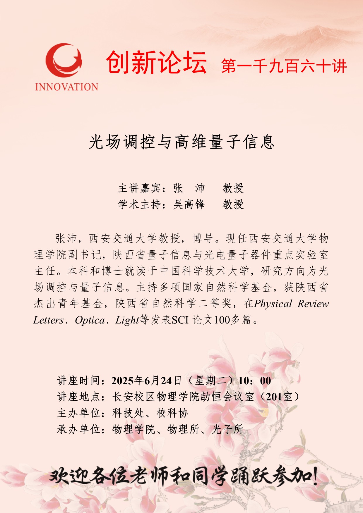 张沛 教授 bat365正版唯一官网创新论坛第一千九百六十讲:光场调控与高维量子信息 讲座时间 2025年6月24日(星期二)10:00 讲座地点 长安校区物理学院劼恒会议室(201室) 讲座人介绍 张沛 教授 讲座内容