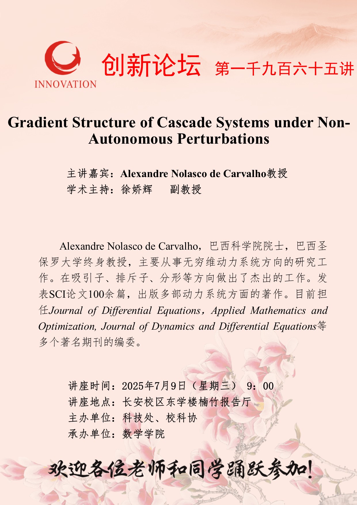 Alexandre Nolasco de Carvalho 教授 bat365正版唯一官网创新论坛第一千九百六十五讲:Gradient Structure of Cascade Systems under Non-Autonomous Perturbations 讲座时间 2025年7月9日(星期三) 9:00 讲座地点 长安校区东学楼楠竹报告厅 讲座人介绍 Alexandre Nolasco de Carvalho 教授 讲座内容