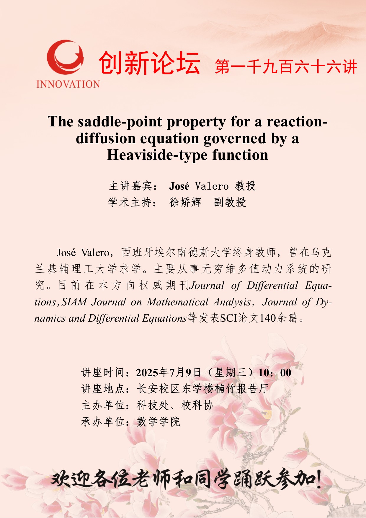 José Valero 教授 bat365正版唯一官网创新论坛第一千九百六十六讲:The saddle-point property for a reaction-diffusion equation governed by a Heaviside-type function 讲座时间 2025年7月9日(星期三)10:00 讲座地点 长安校区东学楼楠竹报告厅 讲座人介绍 José Valero 教授 讲座内容
