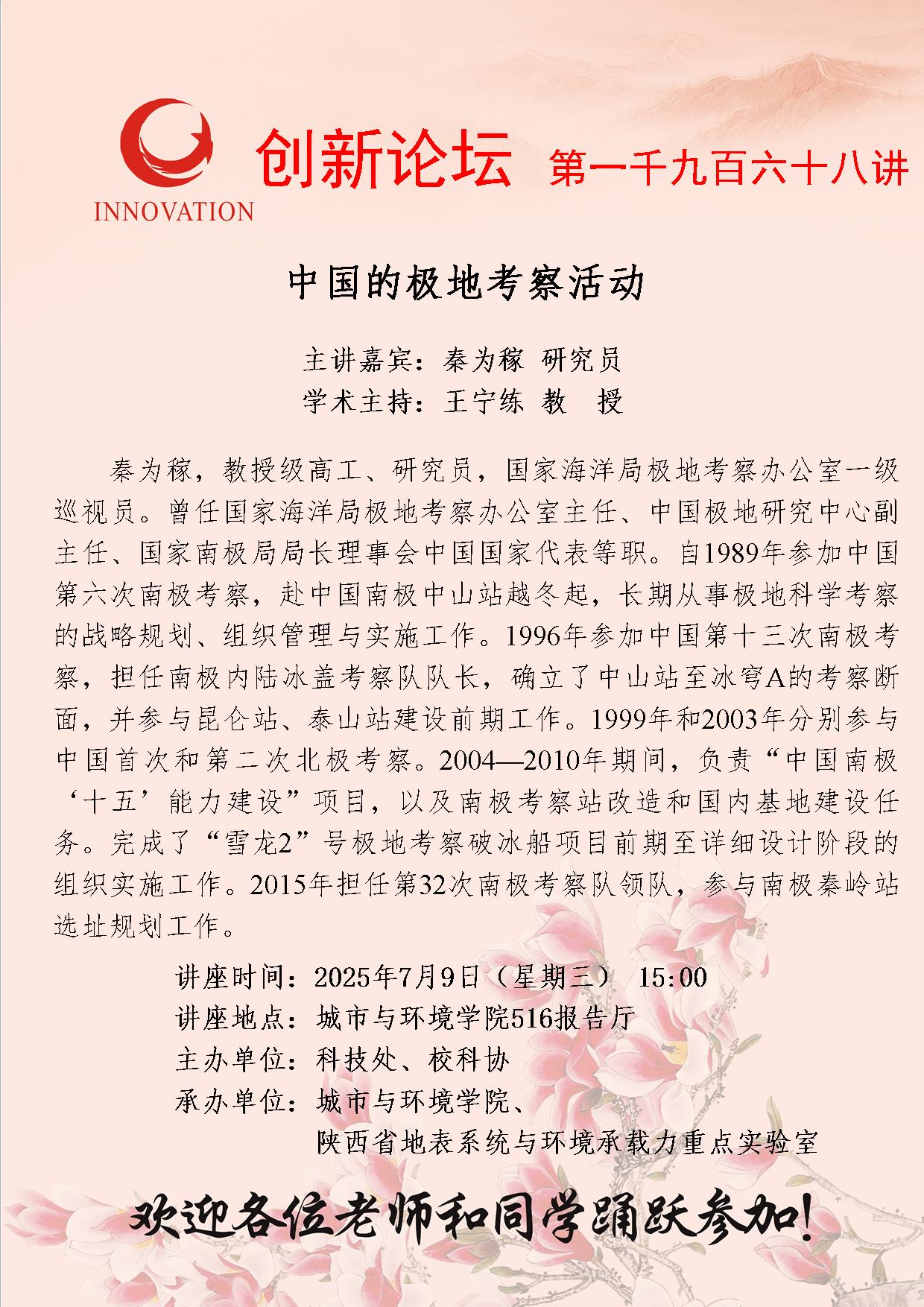 秦为稼 研究员 bat365正版唯一官网创新论坛第一千九百六十八讲:中国的极地考察活动 讲座时间 2025年7月9日(星期三) 15:00 讲座地点 城市与环境学院516报告厅 讲座人介绍 秦为稼 研究员 讲座内容