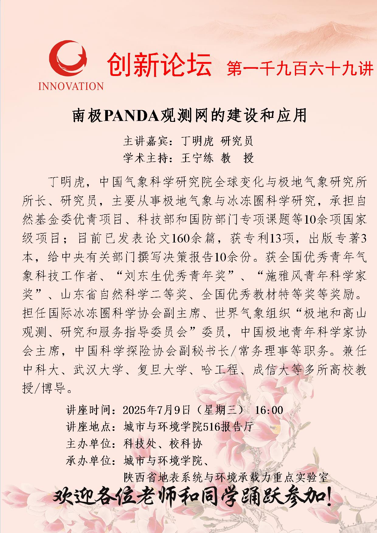 丁明虎 研究员 bat365正版唯一官网创新论坛第一千九百六十九讲:南极PANDA观测网的建设和应用 讲座时间 2025年7月9日(星期三) 16:00 讲座地点 城市与环境学院516报告厅 讲座人介绍 丁明虎 研究员 讲座内容