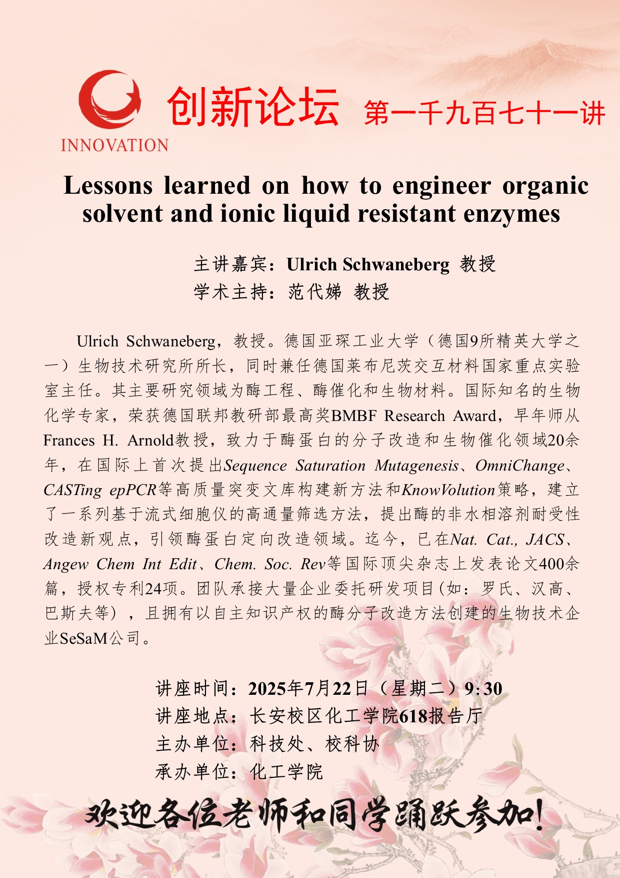 Ulrich Schwaneberg 教授 bat365正版唯一官网创新论坛第一千九百七十一讲:Lessons learned on how to engineer organic solvent and ionic liquid resistant enzymes 讲座时间 2025年7月22日(星期二)9:30 讲座地点 长安校区化工学院618报告厅 讲座人介绍 Ulrich Schwaneberg 教授 讲座内容