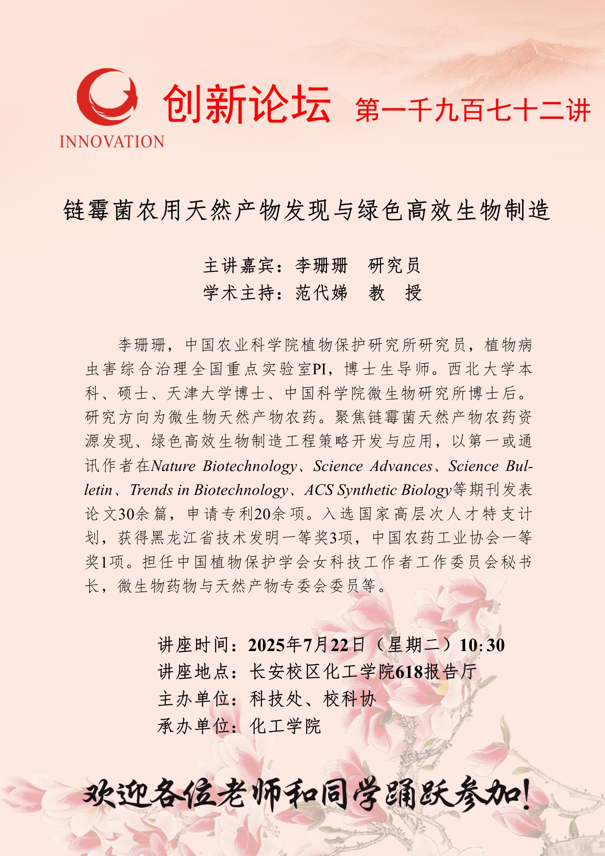 李珊珊 研究员 bat365正版唯一官网创新论坛第一千九百七十二讲:链霉菌农用天然产物发现与绿色高效生物制造 讲座时间 2025年7月22日(星期二)10:30 讲座地点 长安校区化工学院618报告厅 讲座人介绍 李珊珊 研究员 讲座内容