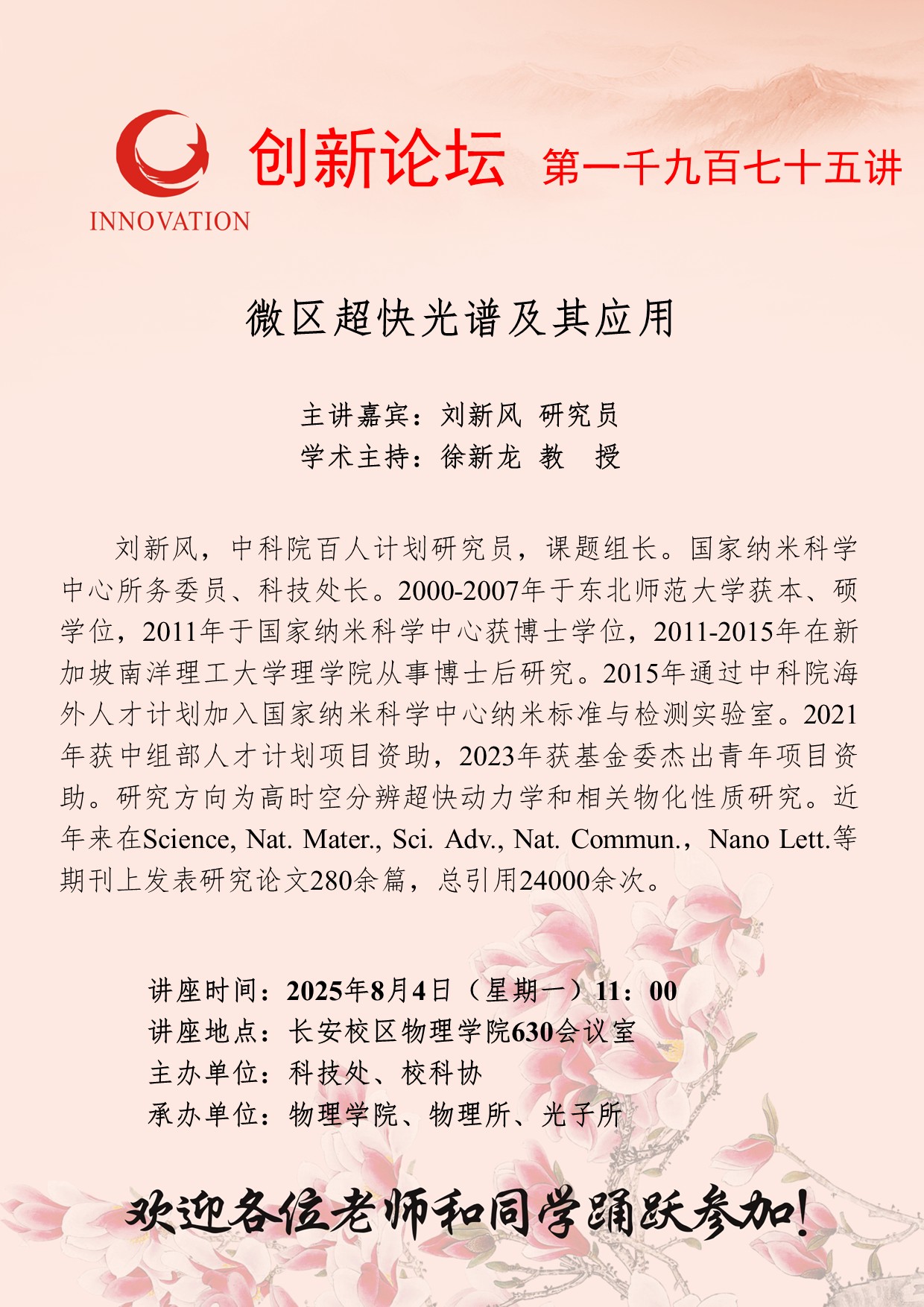 刘新风 研究员 bat365正版唯一官网创新论坛第一千九百七十五讲:微区超快光谱及其应用 讲座时间 2025年8月4日(星期一) 讲座地点 长安校区物理学院630会议室 讲座人介绍 刘新风 研究员 讲座内容