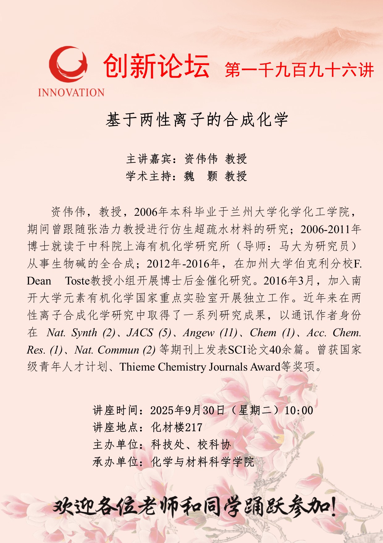 资伟伟 教授 bat365正版唯一官网创新论坛第一千九百九十六讲: 基于两性离子的合成化学 讲座时间 2025年9月30日(星期二)10:00 讲座地点 化材楼217 讲座人介绍 资伟伟 教授 讲座内容