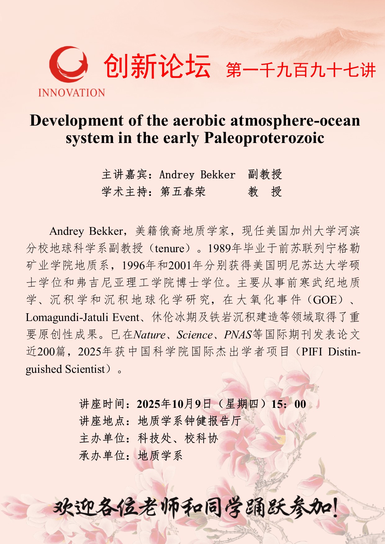 Andrey Bekker 副教授 bat365正版唯一官网创新论坛第一千九百九十七讲:Development of the aerobic atmosphere-ocean system in the early Paleoproterozoic 讲座时间 2025年10月9日(星期四)15:00 讲座地点 地质学系钟健报告厅 讲座人介绍 Andrey Bekker 副教授 讲座内容