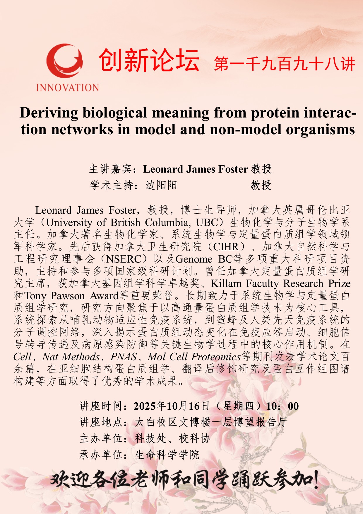 Leonard James Foster 教授 bat365正版唯一官网创新论坛第一千九百九十八讲:Deriving biological meaning from protein interaction networks in model and non-model organisms 讲座时间 2025年10月16日(星期四)10:00 讲座地点 太白校区文博楼一层博望报告厅 讲座人介绍 Leonard James Foster 教授 讲座内容