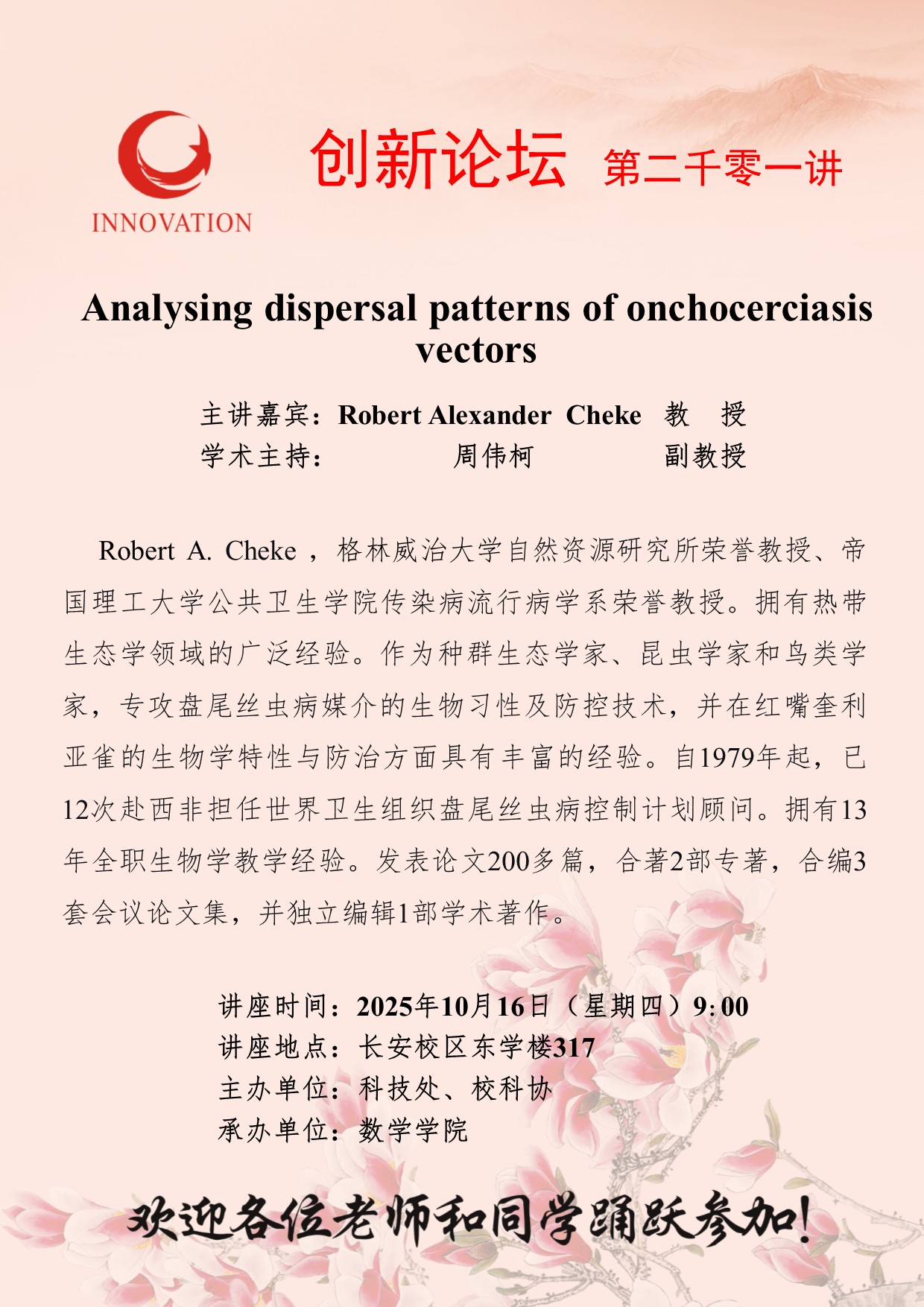 Robert Alexander Cheke 教授 bat365正版唯一官网创新论坛第二千零一讲:Analysing dispersal patterns of onchocerciasis vectors 讲座时间 2025年10月16日(星期四)9:00 讲座地点 长安校区东学楼317 讲座人介绍 Robert Alexander Cheke 教授 讲座内容