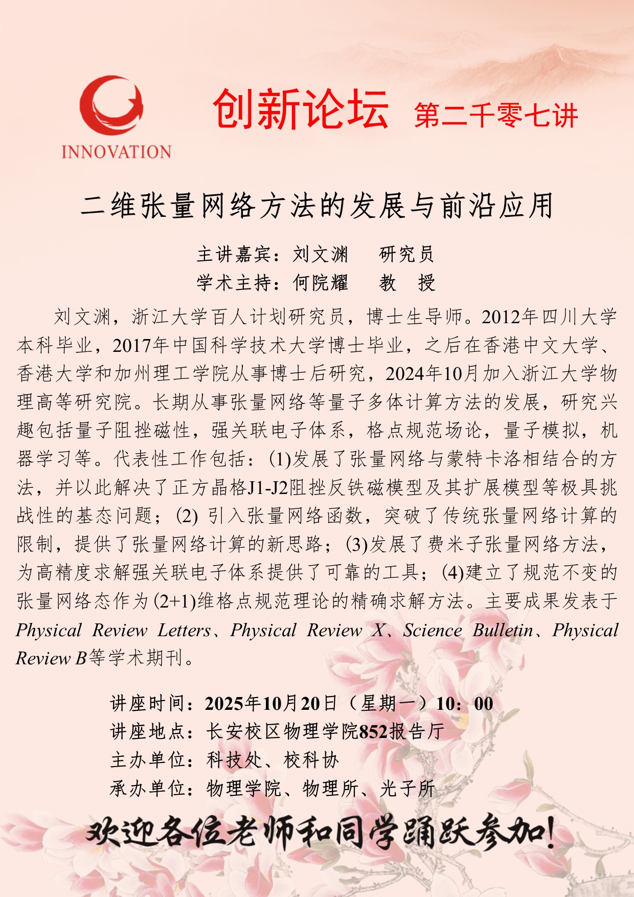 刘文渊 研究员 bat365正版唯一官网创新论坛第二千零七讲:二维张量网络方法的发展与前沿应用 讲座时间 2025年10月20日(星期一)10:00 讲座地点 长安校区物理学院852报告厅 讲座人介绍 刘文渊 研究员 讲座内容
