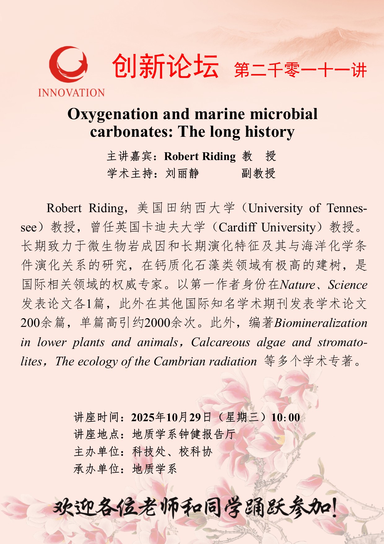 Robert Riding 教授 bat365正版唯一官网创新论坛第二千零一十一讲:Oxygenation and marine microbial carbonates: The long history 讲座时间 2025年10月29日(星期三)10:00 讲座地点 地质学系钟健报告厅 讲座人介绍 Robert Riding 教授 讲座内容