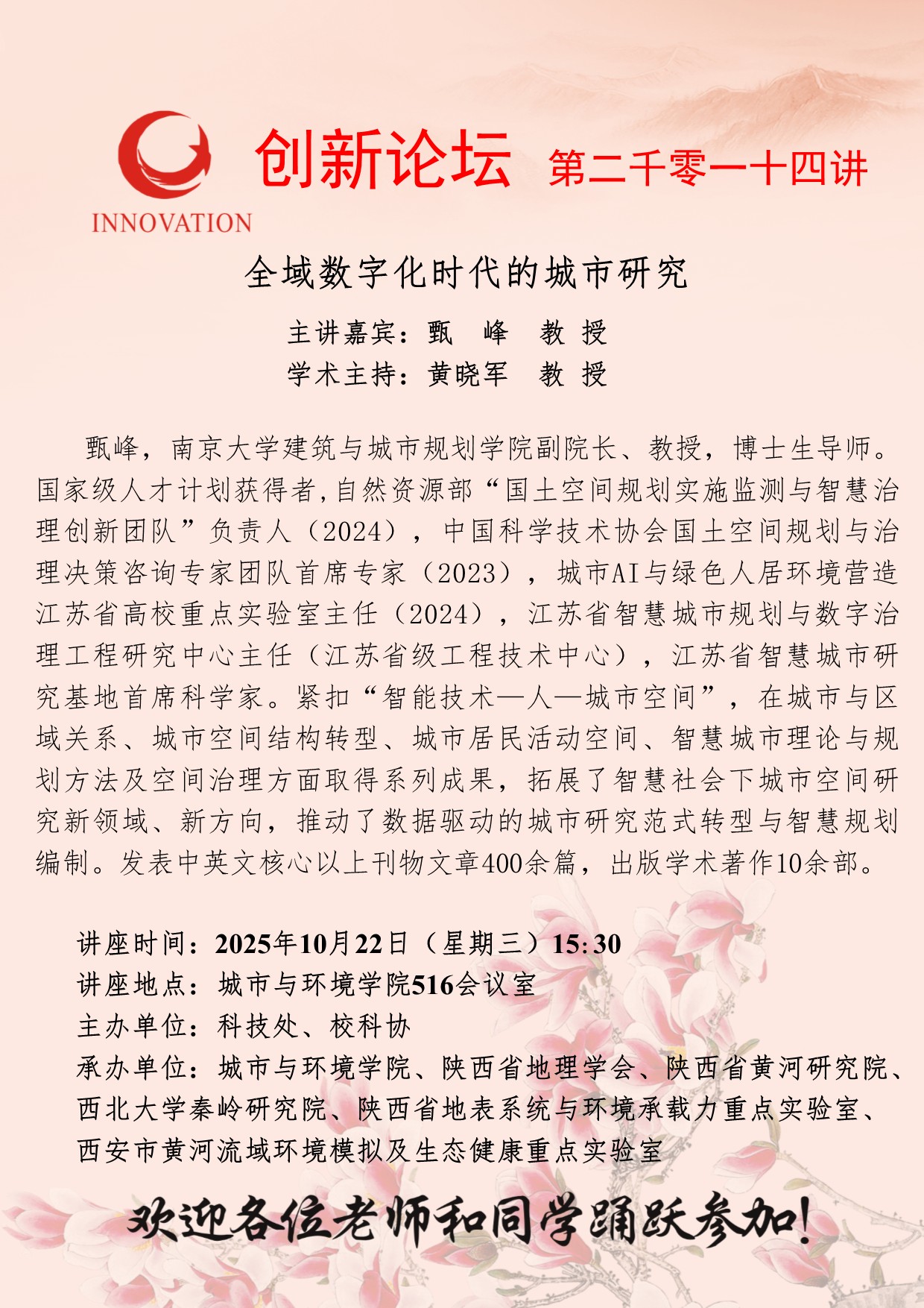 甄峰 教授 bat365正版唯一官网创新论坛第二千零一十四讲:全域数字化时代的城市研究 讲座时间 2025年10月22日(星期三)15:30 讲座地点 城市与环境学院516会议室 讲座人介绍 甄峰 教授 讲座内容