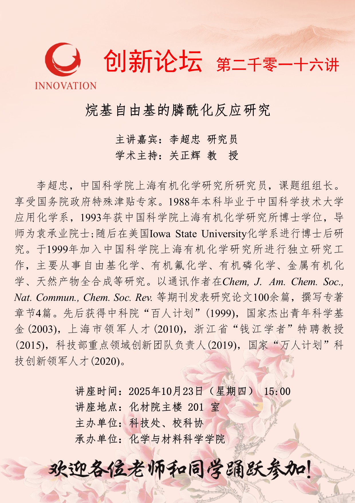 李超忠 研究员 bat365正版唯一官网创新论坛第二千零一十六讲:烷基自由基的膦酰化反应研究 讲座时间 2025年10月23日(星期四) 15:00 讲座地点 化材院主楼 201 室 讲座人介绍 李超忠 研究员 讲座内容