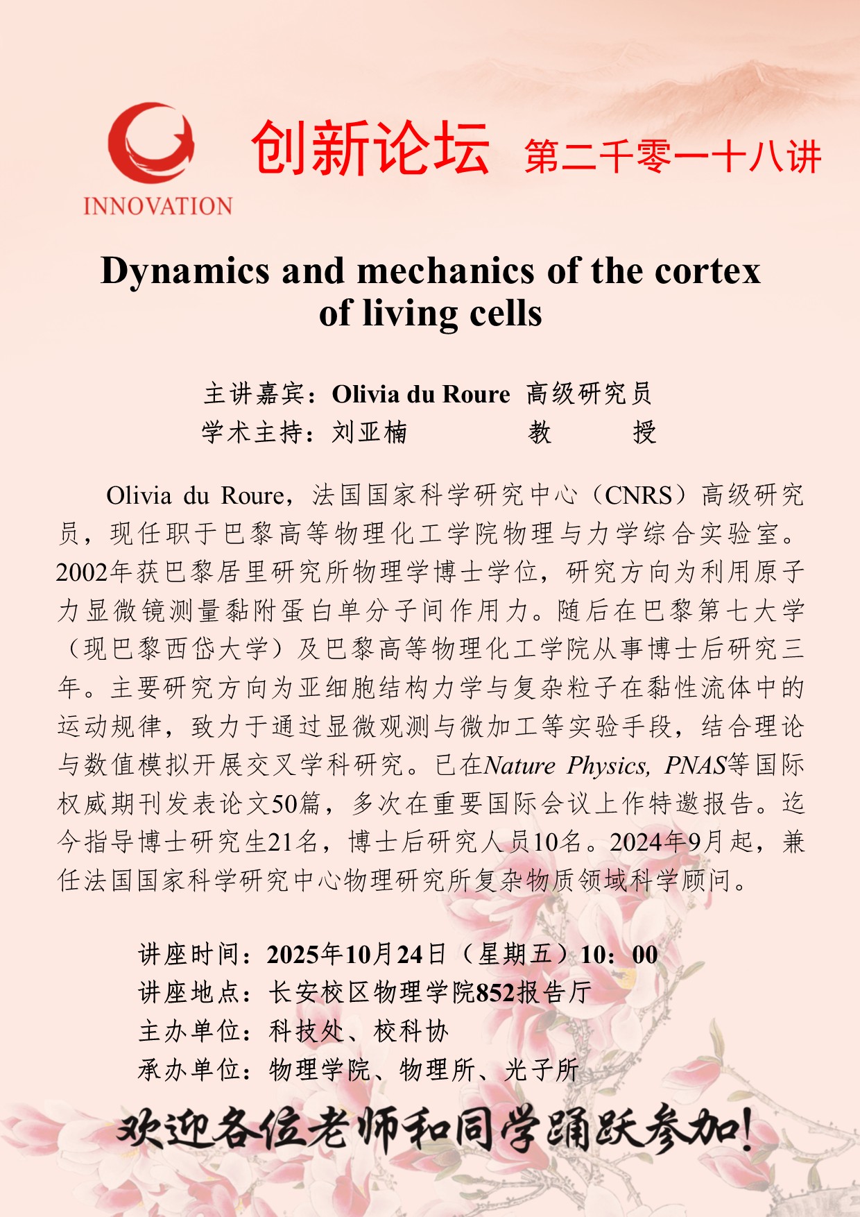 Olivia du Roure 高级研究员 bat365正版唯一官网创新论坛第二千零一十八讲:Dynamics and mechanics of the cortex of living cells 讲座时间 2025年10月24日(星期五)10:00 讲座地点 长安校区物理学院852报告厅 讲座人介绍 Olivia du Roure 高级研究员 讲座内容