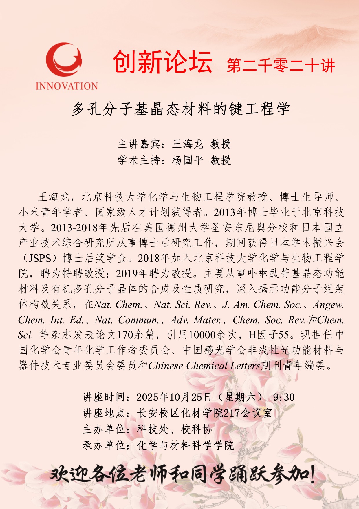 王海龙 教授 bat365正版唯一官网创新论坛第二千零二十讲:多孔分子基晶态材料的键工程学 讲座时间 2025年10月25日(星期六) 9:30 讲座地点 长安校区化材学院217会议室 讲座人介绍 王海龙 教授 讲座内容