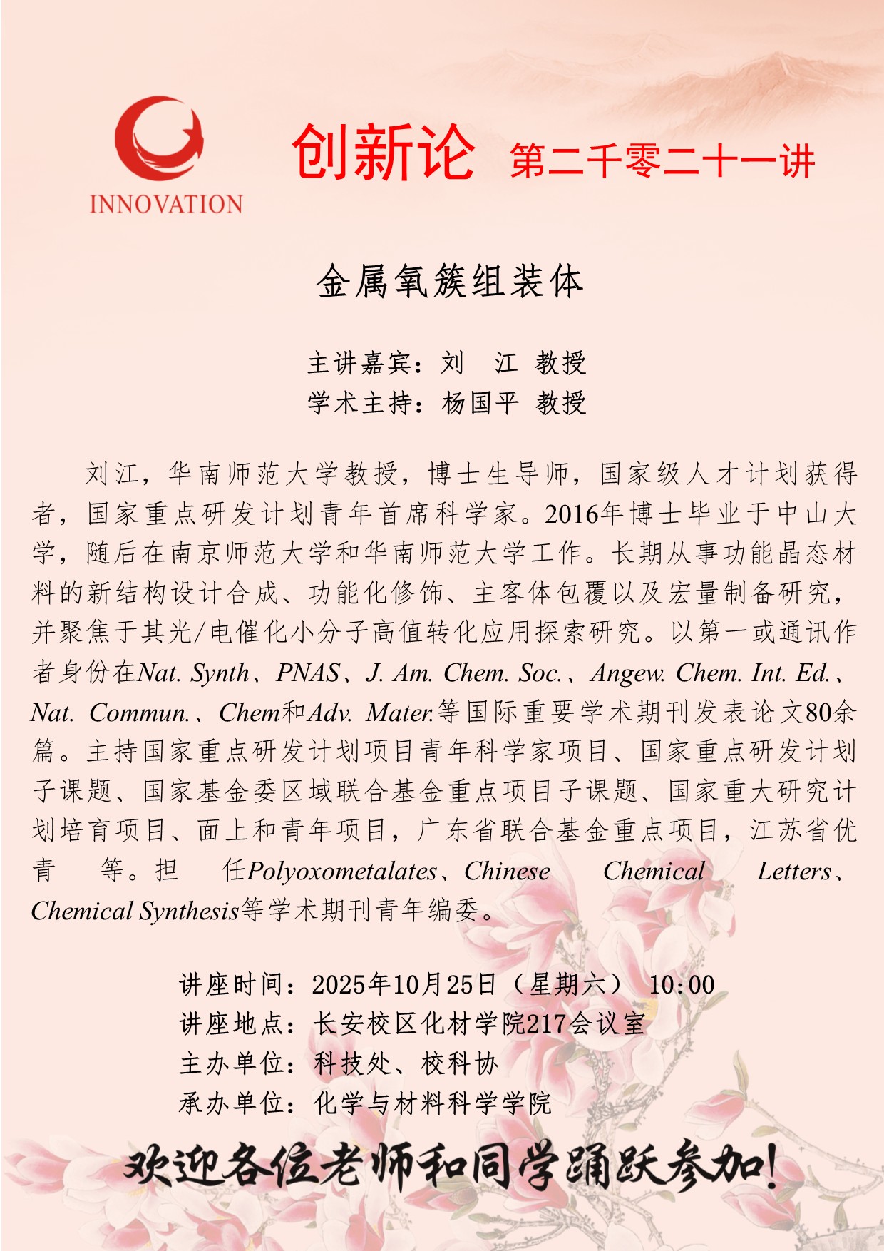 刘 江 教授 bat365正版唯一官网创新论坛第二千零二十一讲:金属氧簇组装体 讲座时间 2025年10月25日(星期六) 10:00 讲座地点 长安校区化材学院217会议室 讲座人介绍 刘 江 教授 讲座内容