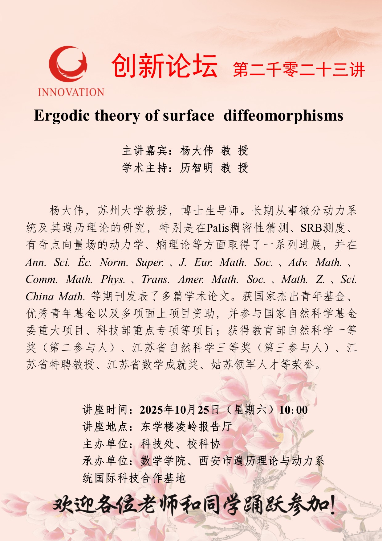 杨大伟 教 授 bat365正版唯一官网创新论坛第二千零二十三讲:Ergodic theory of surface diffeomorphisms 讲座时间 2025年10月25日(星期六)10:00 讲座地点 东学楼凌岭报告厅 讲座人介绍 杨大伟 教 授 讲座内容