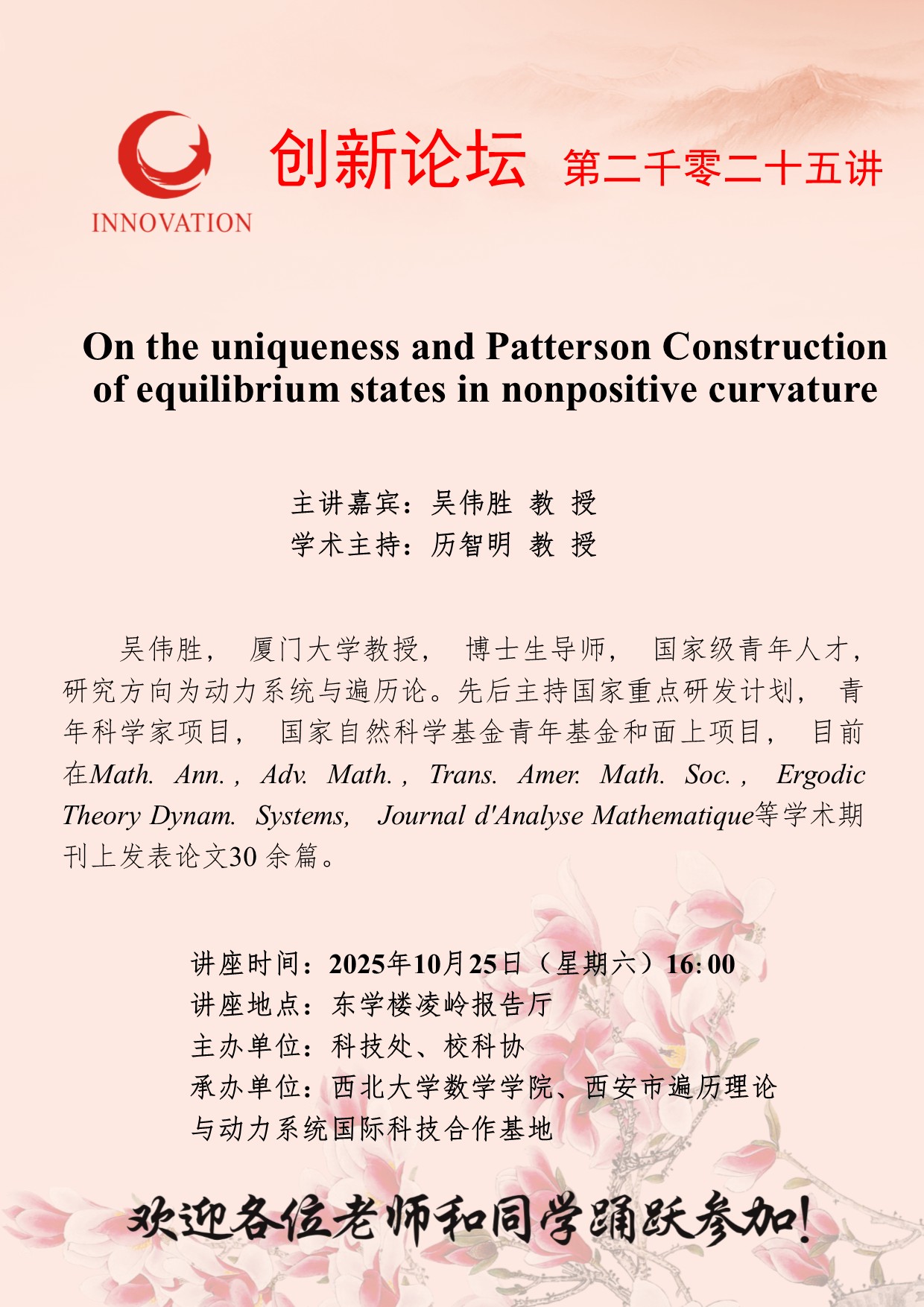 吴伟胜 教 授 bat365正版唯一官网创新论坛第二千零二十五讲:On the uniqueness and Patterson Construction of equilibrium states in nonpositive curvature 讲座时间 2025年10月25日(星期六)16:00 讲座地点 东学楼凌岭报告厅 讲座人介绍 吴伟胜 教 授 讲座内容
