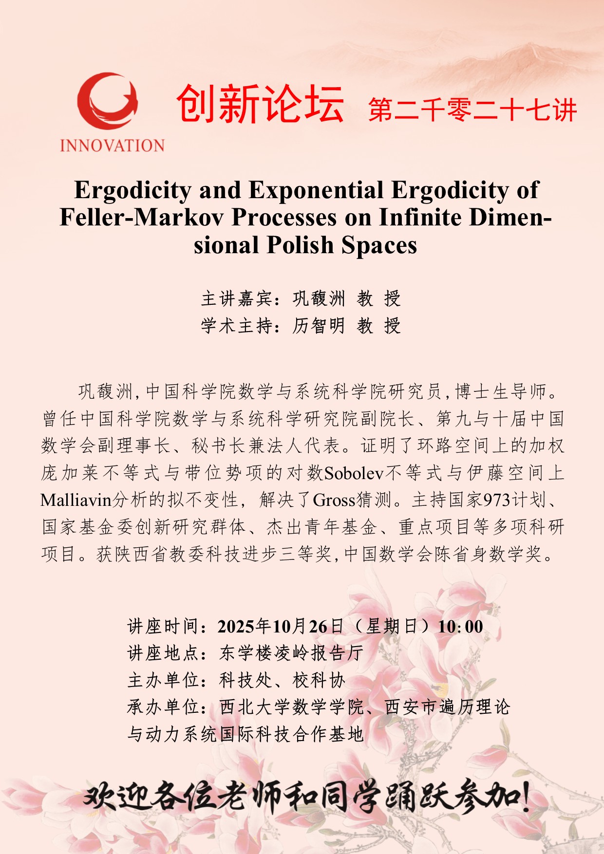 巩馥洲 教 授 bat365正版唯一官网创新论坛第二千零二十七讲:Ergodicity and Exponential Ergodicity of Feller-Markov Processes on Infinite Dimensional Polish Spaces 讲座时间 2025年10月26日(星期日)10:00 讲座地点 东学楼凌岭报告厅 讲座人介绍 巩馥洲 教 授 讲座内容