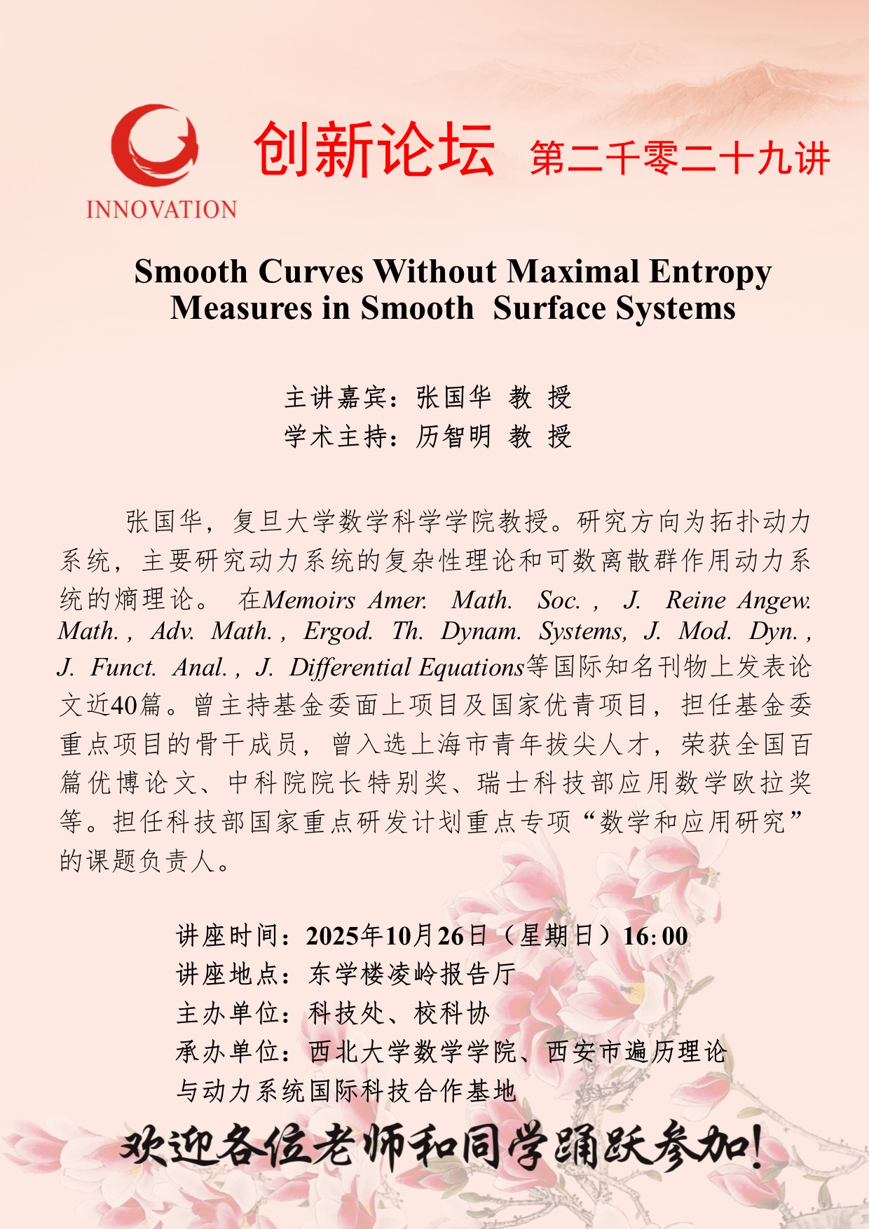 张国华 教 授 bat365正版唯一官网创新论坛第二千零二十九讲:Smooth Curves Without Maximal Entropy Measures in Smooth Surface Systems 讲座时间 2025年10月26日(星期日)16:00 讲座地点 东学楼凌岭报告厅 讲座人介绍 张国华 教 授 讲座内容