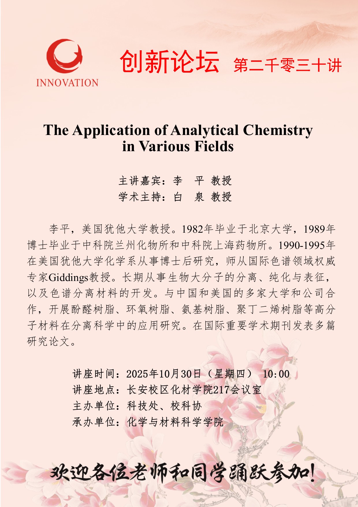 李 平 教授 bat365正版唯一官网创新论坛第二千零三十讲:The Application of Analytical Chemistry in Various Fields 讲座时间 2025年10月30日(星期四) 10:00 讲座地点 长安校区化材学院217会议室 讲座人介绍 李 平 教授 讲座内容