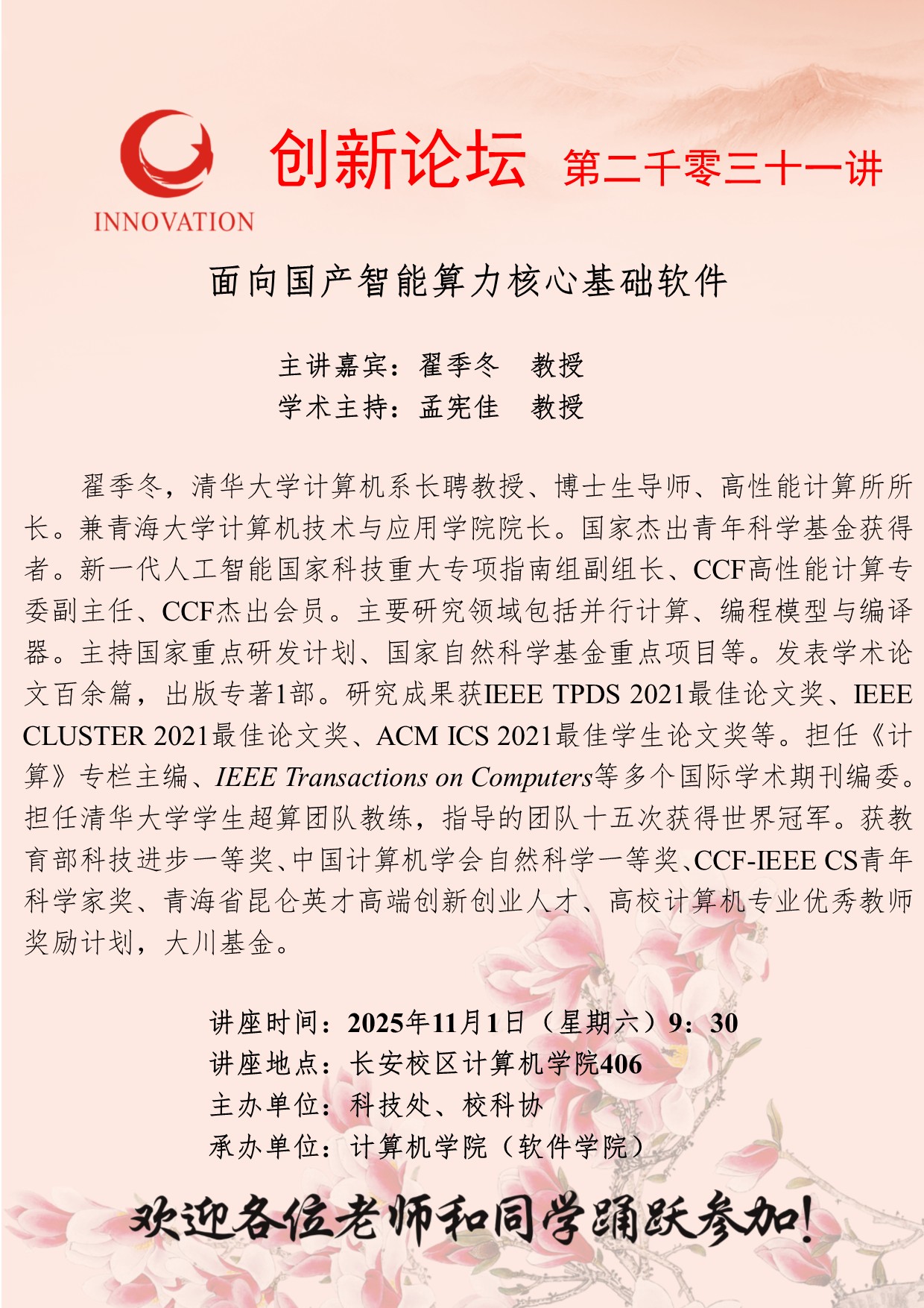 翟季冬 教授 bat365正版唯一官网创新论坛第二千零三十一讲:面向国产智能算力核心基础软件 讲座时间 2025年11月1日(星期六)9:30 讲座地点 长安校区计算机学院406 讲座人介绍 翟季冬 教授 讲座内容