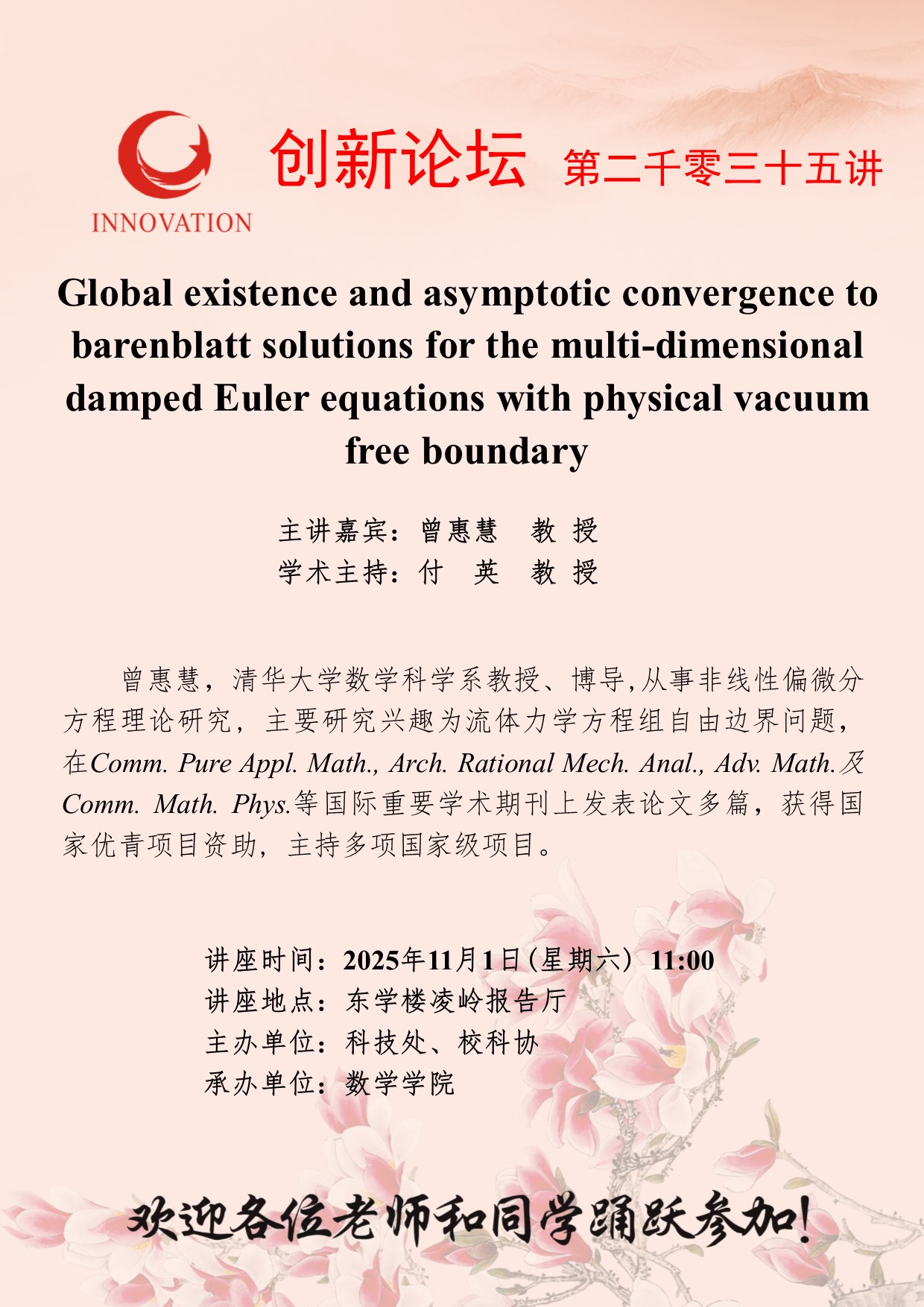 曾惠慧 教 授 bat365正版唯一官网创新论坛第二千零三十五讲:Global existence and asymptotic convergence to barenblatt solutions for the multi-dimensional damped Euler equations with physical vacuum free boundary 讲座时间 2025年11月1日(星期六) 11:00 讲座地点 东学楼凌岭报告厅 讲座人介绍 曾惠慧 教 授 讲座内容