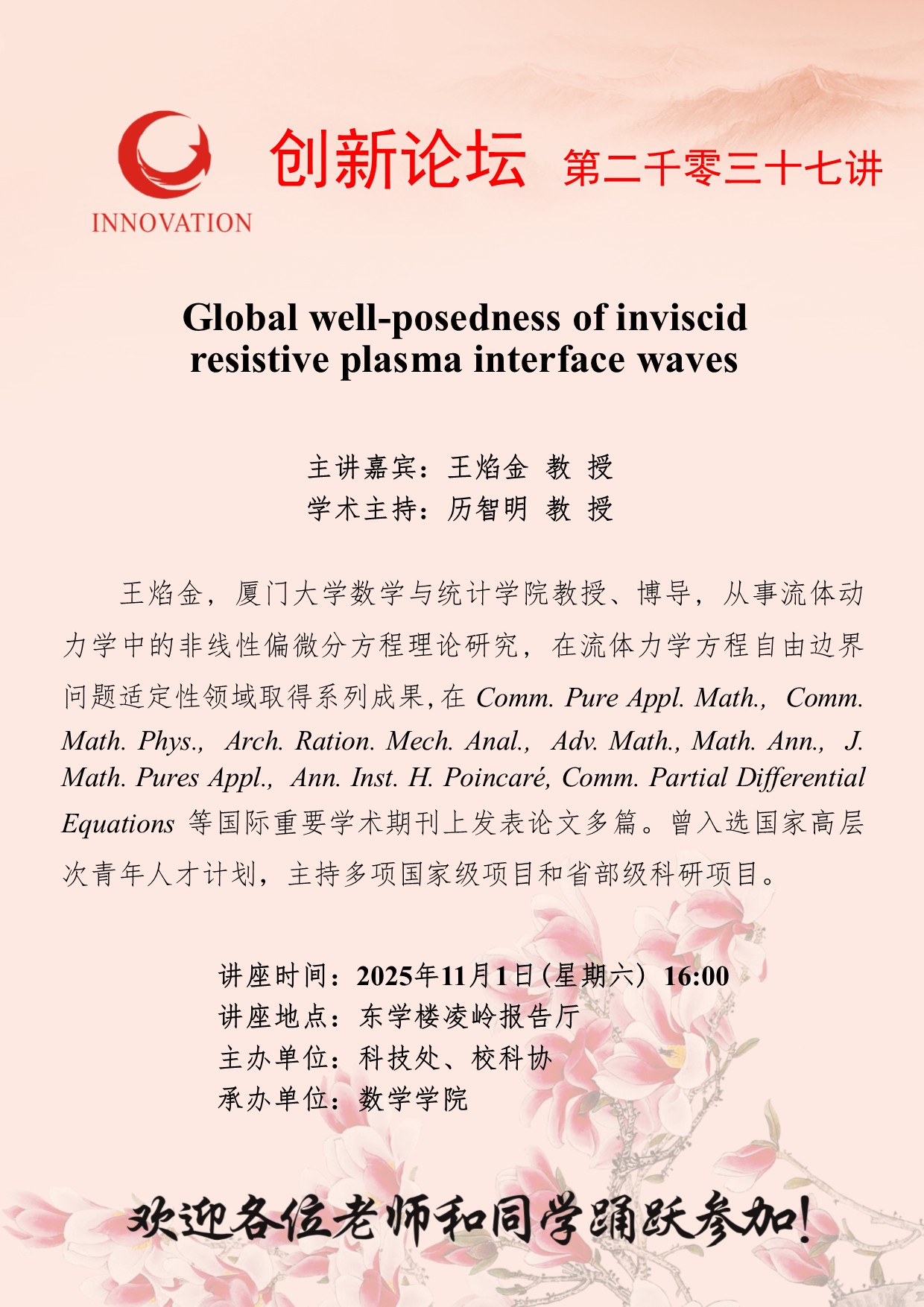 王焰金 教 授 bat365正版唯一官网创新论坛第二千零三十七讲:Global well-posedness of inviscid resistive plasma interface waves 讲座时间 2025年11月1日(星期六) 16:00 讲座地点 东学楼凌岭报告厅 讲座人介绍 王焰金 教 授 讲座内容