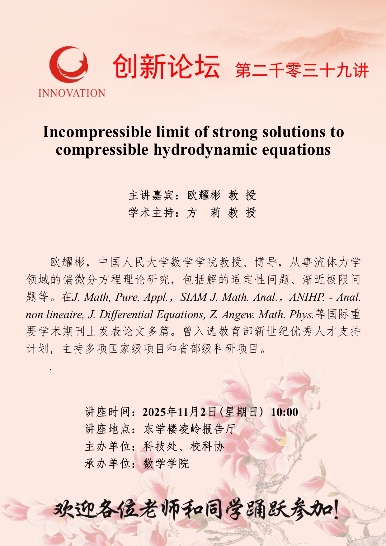 欧耀彬 教 授 bat365正版唯一官网创新论坛第二千零三十九讲:Incompressible limit of strong solutions to compressible hydrodynamic equations 讲座时间 2025年11月2日(星期日) 10:00 讲座地点 东学楼凌岭报告厅 讲座人介绍 欧耀彬 教 授 讲座内容