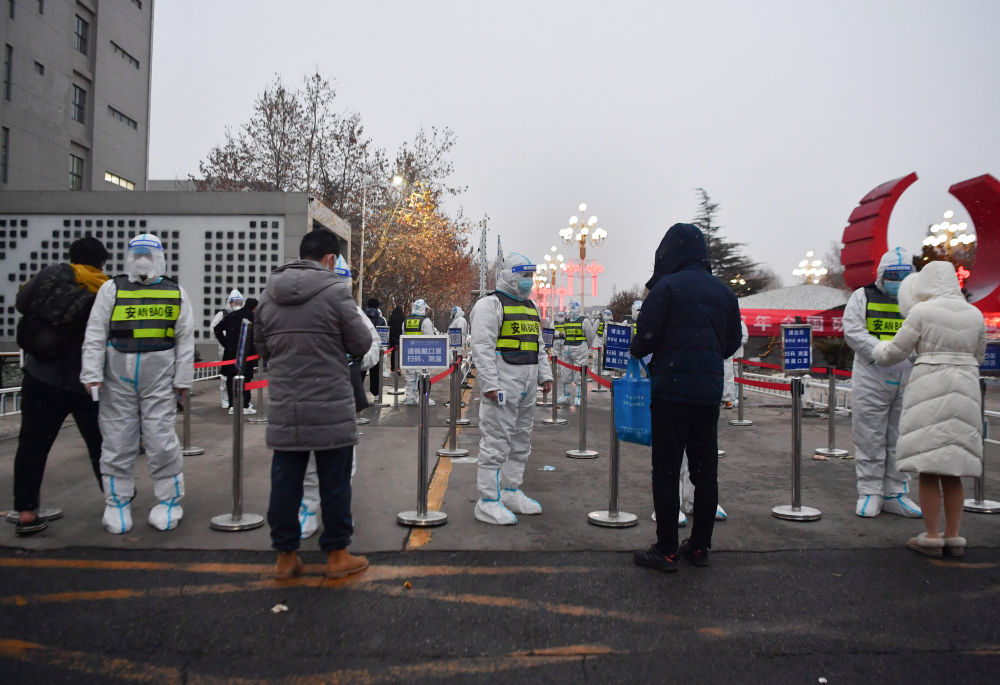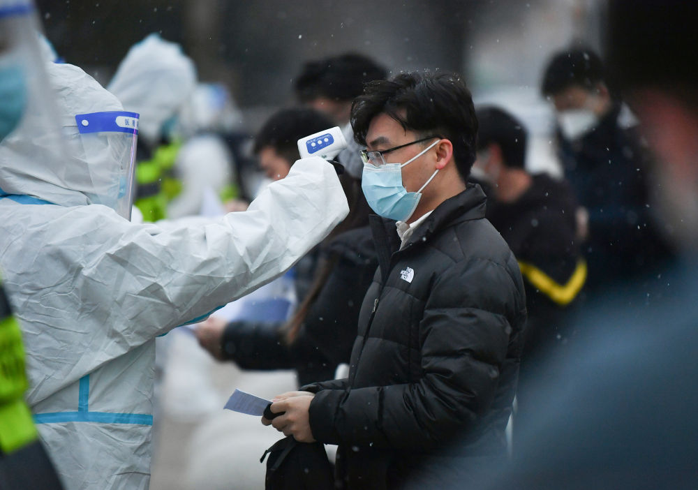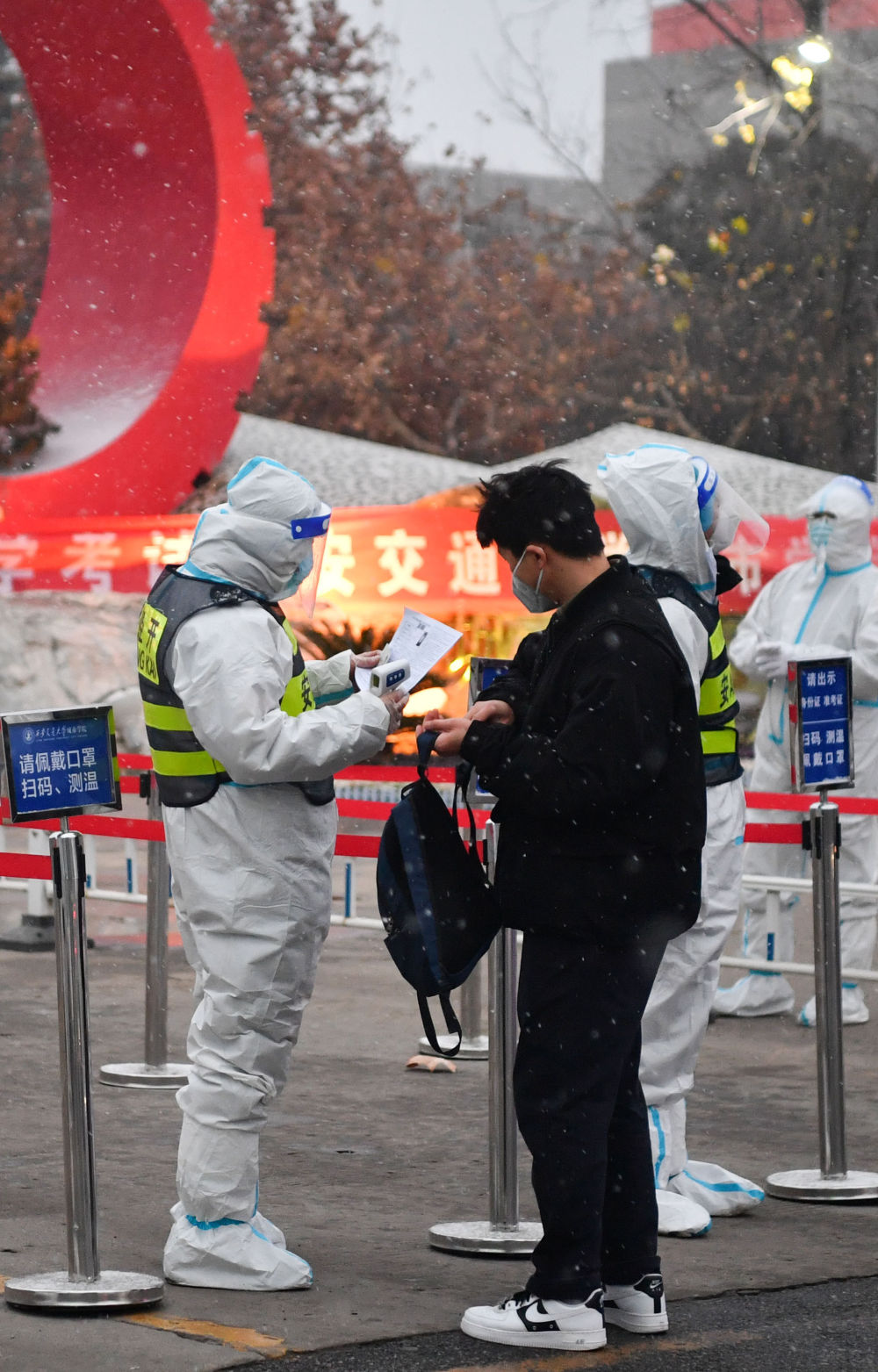 ↑12月25日,在西安交通大学城市学院考点,工作人员为考生测温。新华社记者 张博文 摄