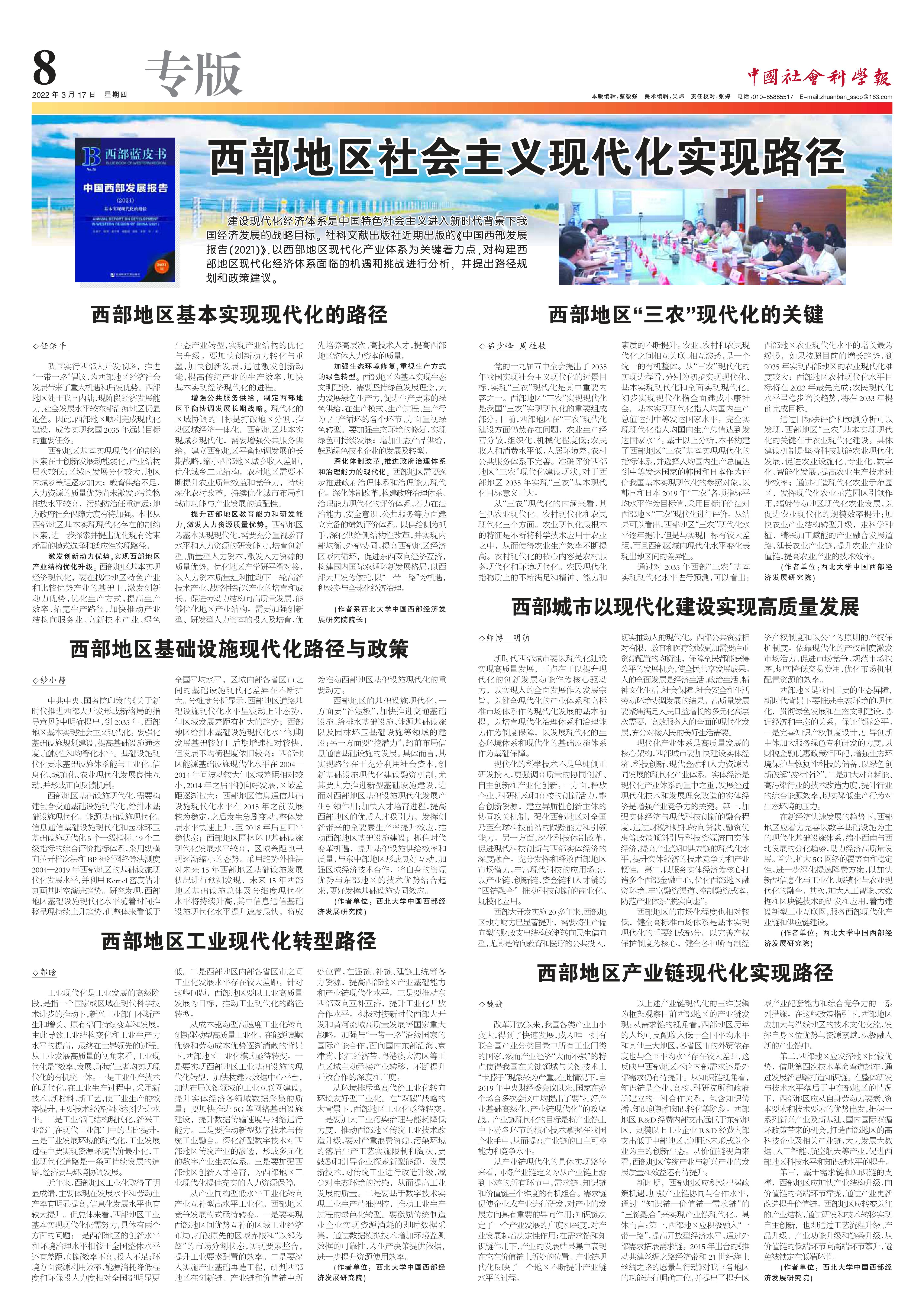 专版报道,建设现代化经济体系是中国特色社会主义进入新时代的背景下我国经济发展的战略目标。《中国西部发展报告(2021)》以西部地区现代化产业体系为关键着力点,对西部地区现代化经济体系构建所面临的机遇和挑战进行分析,为西部地区现代化经济体系构建与完善提供了路径规划和政策建议。本期专版摘录了6篇研究报告的主要观点,其中有任保平教授的《西部地区基本实现现代化的路径》、茹少峰教授的《西部地区“三农”现代化的关键、钞小静教授的《西部地区基础设施现代化的路径与政策》、师博教授的《西部城市以现代化建设实现高质量发展》、郭晗副教授的《西部地区工业现代化路径转型》、魏婕副教授的《西部地区产业链现代化实现路径》。