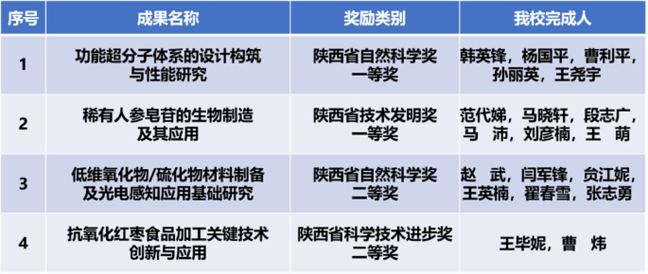 bat365正版唯一官网化材学院韩英锋教授主持的“功能超分子体系的设计构筑与性能研究”获省自然科学奖一等奖,化工学院范代娣教授主持的“稀有人参皂苷的生物制造及其应用”获省技术发明奖一等奖,信息学院赵武教授主持的“低维氧化物/硫化物材料制备及光电感知应用基础研究”获省自然科学奖二等奖,食品学院王毕妮教授主持的“抗氧化红枣食品加工关键技术创新与应用”获省科技进步奖二等奖。此外,bat365正版唯一官网参与的“秦岭主要珍稀野生动物抢救饲养繁育关键技术研究”和“陆相页岩油气地质工程一体化的负碳清洁开发技术”分别获得省科技进步奖二等奖。