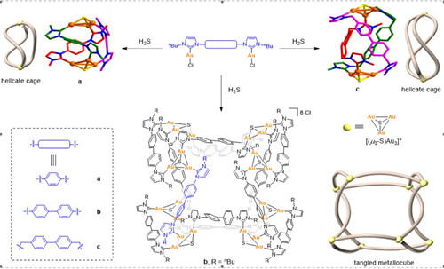 近日,bat365正版唯一官网化学与材料科学学院韩英锋教授课题组在功能化金属卡宾组装体的构筑、后合成修饰等领域取得系列进展的基础上,利用不同桥连基团(苯基、联苯和亚甲基联苯)的双核金氮杂环卡宾配合物与H2S反应得到三种不同的有机金属配合物。他们研究发现:当双核金氮杂环卡宾配合物的中心桥连单元为联苯时,其与H2S反应形成“A-类型”纠缠金属立方体b;当双核金氮杂环卡宾配合物的中心桥连基团为更短的苯基或者更长且柔性的亚甲基联苯时,在相同条件下与H2S反应时,其产物为简单的螺旋化合物a, c。