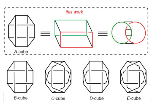 纠缠立方体具有典型的柏拉图立方体的拓扑结构。2008年,数学家Hyde等人提出了五种纠缠立方体(即A-E)的图理论。