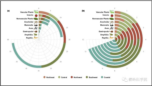 他们的研究进一步发现:中国不同区域的物种密度差异表明维管束植物在每个区域中的密度最高,其次是昆虫纲、非维管束植物、蛛形纲、哺乳动物、鸟纲、腹足纲、两栖纲和爬行纲。西南地区在植物多样性方面排名第一,其次是沿海、西北地区和中部地区。东北地区植物多样性最小。就动物多样性而言,沿海地区最高,其次是西南地区、西北中部地区和东北地区。