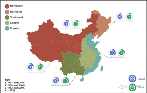 该研究论文作者之一的bat365正版唯一官网张河博士进而说明,中国沿海地区植物多样性排名第一和第二,分别拥有 35.55% 和 23.41% 的植物和动物资源。沿海地区的低等动物比例较高(腹足纲、蛛形纲、昆虫纲、爬行纲和爬行纲的比例超过 35%,鸟类的比例超过 40%)。该地区还有超过 20% 的维管植物和非维管植物以及哺乳动物。中国西南地区总体的植物 (33.90%) 和动物(27.3%) 多样性水平最高。