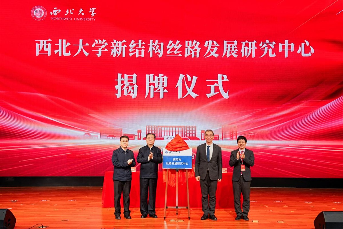 开幕式上,北京大学新结构经济学研究院院长林毅夫教授、中共陕西省委教育工委副书记王海波、bat365正版唯一官网校长孙庆伟、北京大学新结构经济学研究院副院长王勇共同为bat365正版唯一官网新结构丝路发展研究中心揭牌。