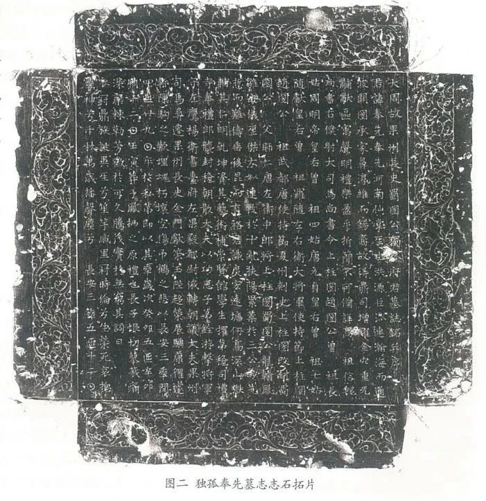 独孤氏起源有多种说法,其一为鲜卑族后裔,独孤信的3个女儿分别是北周、隋、唐三朝的皇后,使独孤信被后世誉为“天下第一老丈人”。独孤信的玄孙独孤奉先的墓志文在介绍完独孤信的官爵之后,紧接着说明其“曾祖长姑周明帝皇后;曾祖四姑,唐元贞皇后;曾祖七姑, 隋献皇后”,字里行间透露出作为独孤家族后裔的荣耀。